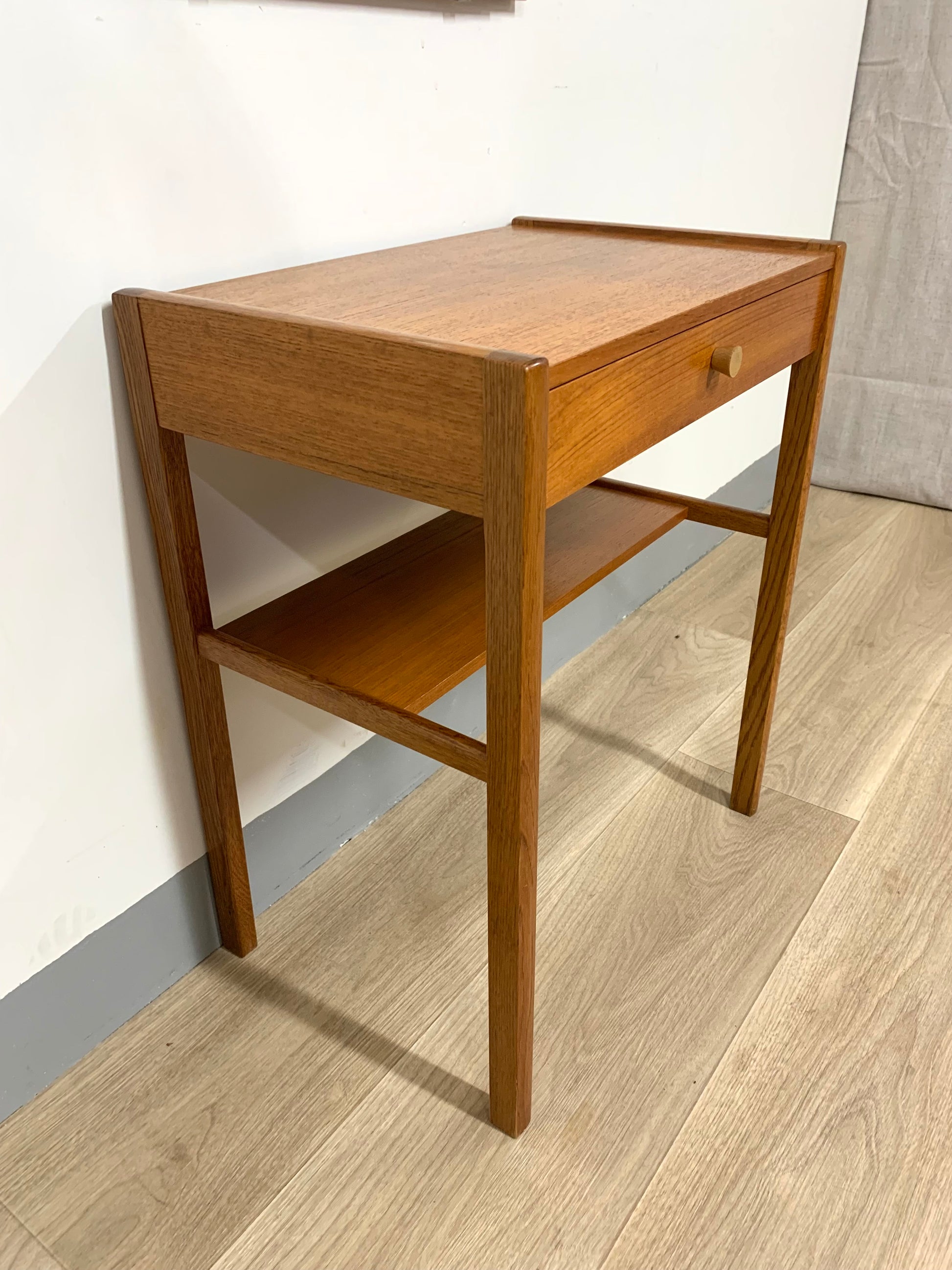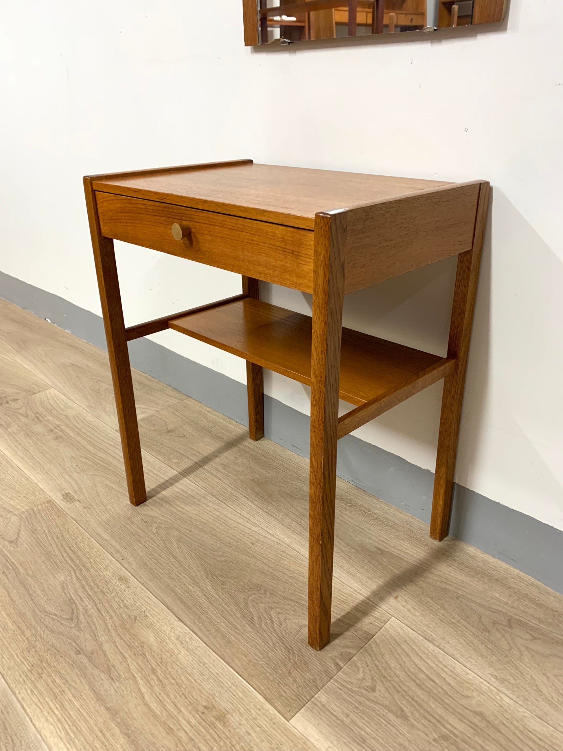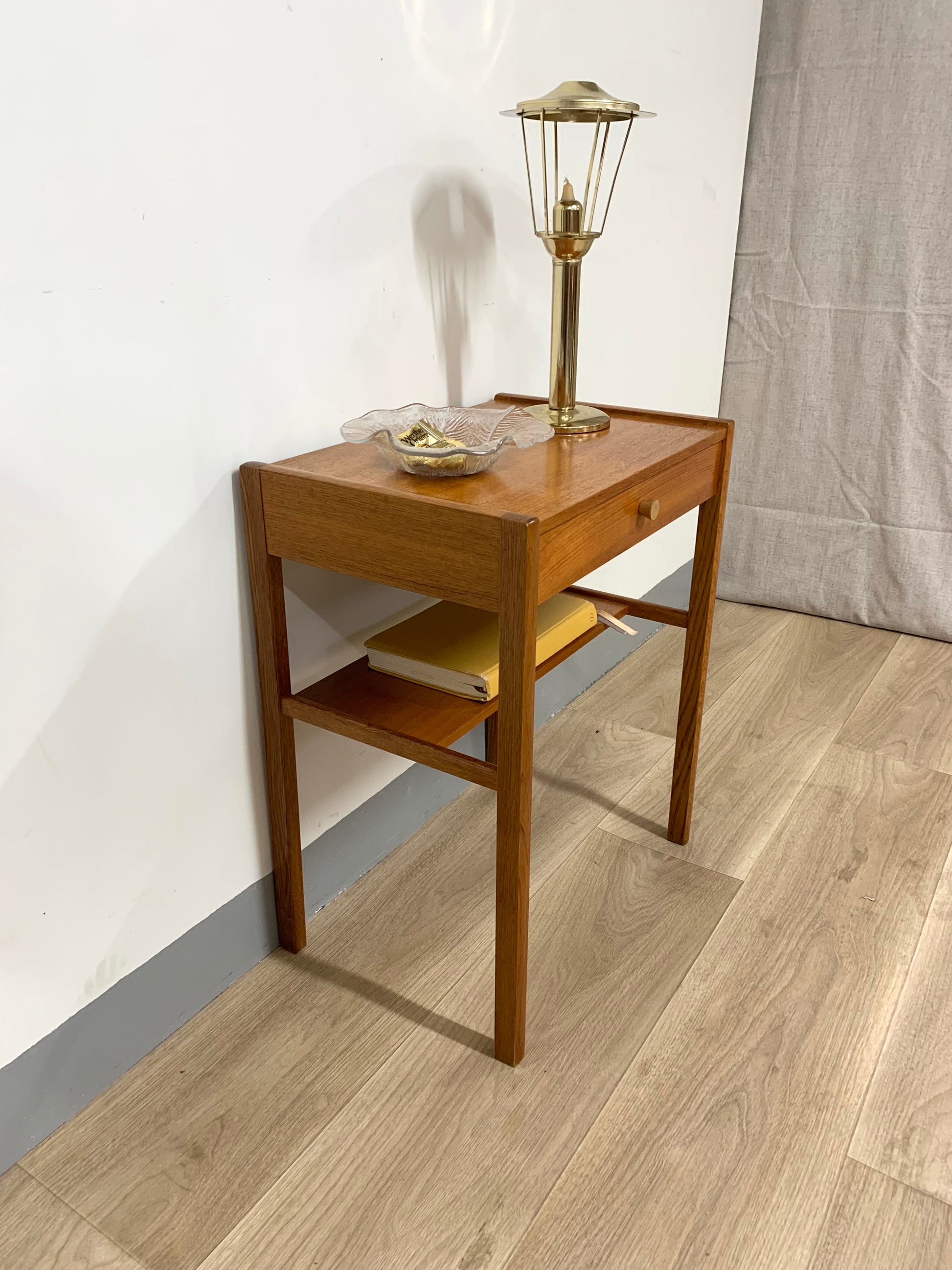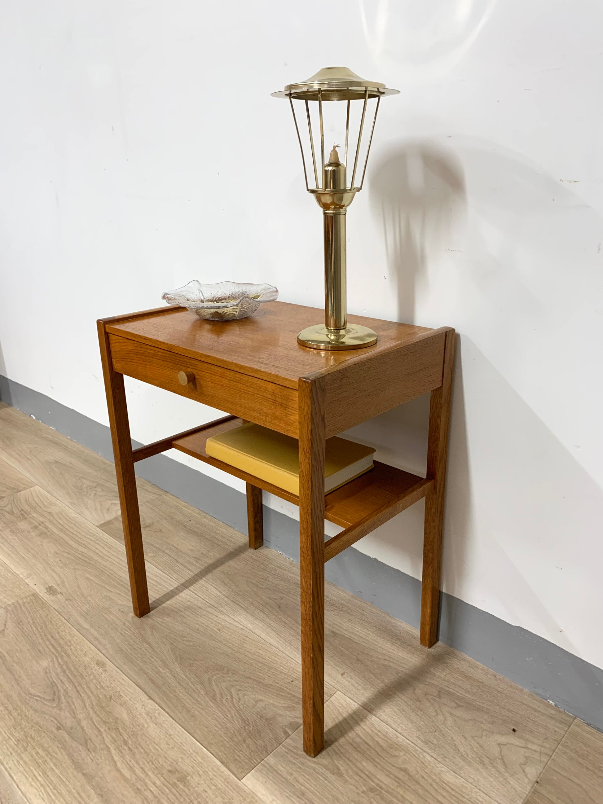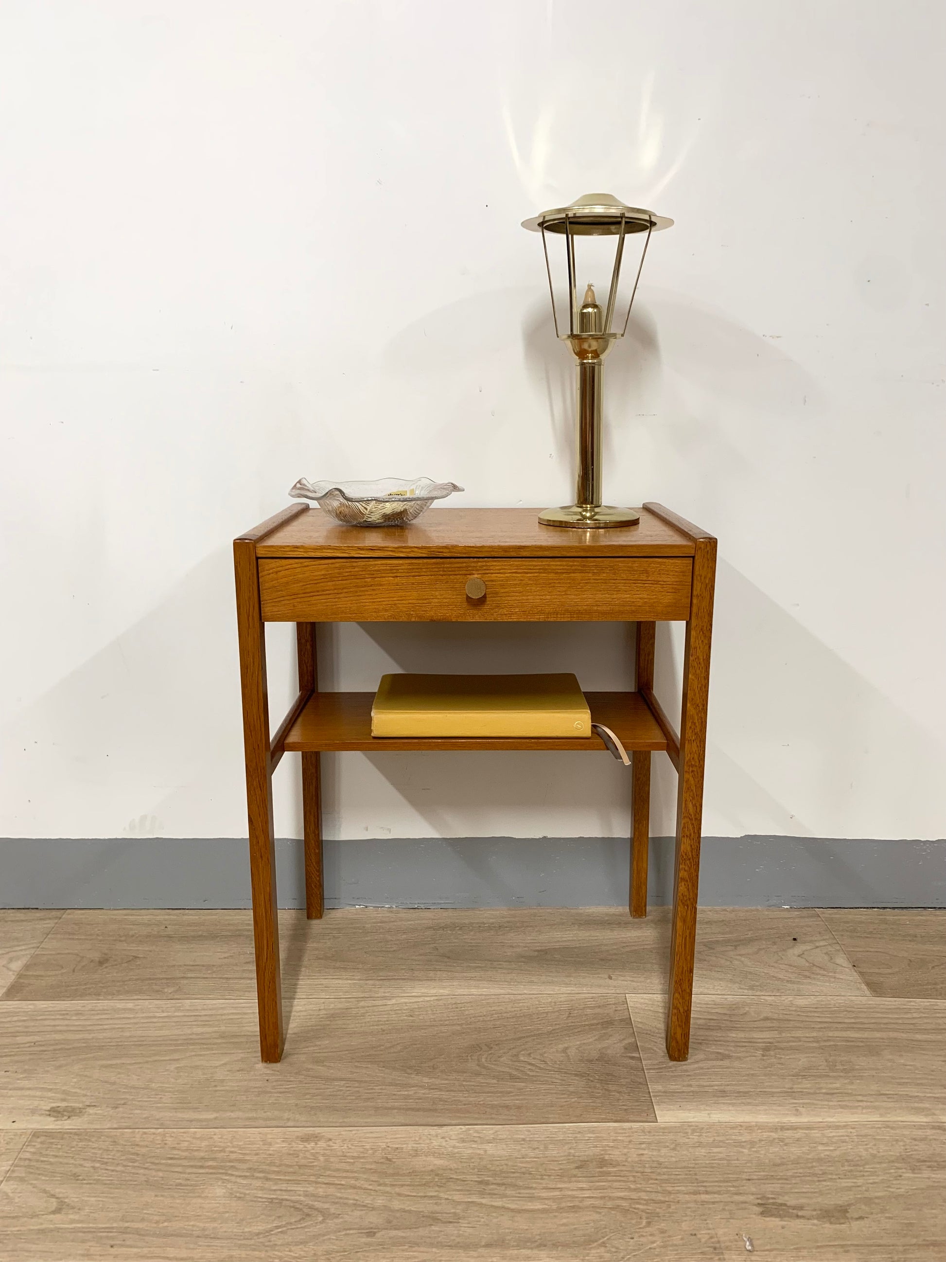 Details: Compact and functional design with one drawer, an open lower shelf, and straight legs. The round wooden drawer pull adds a subtle touch.