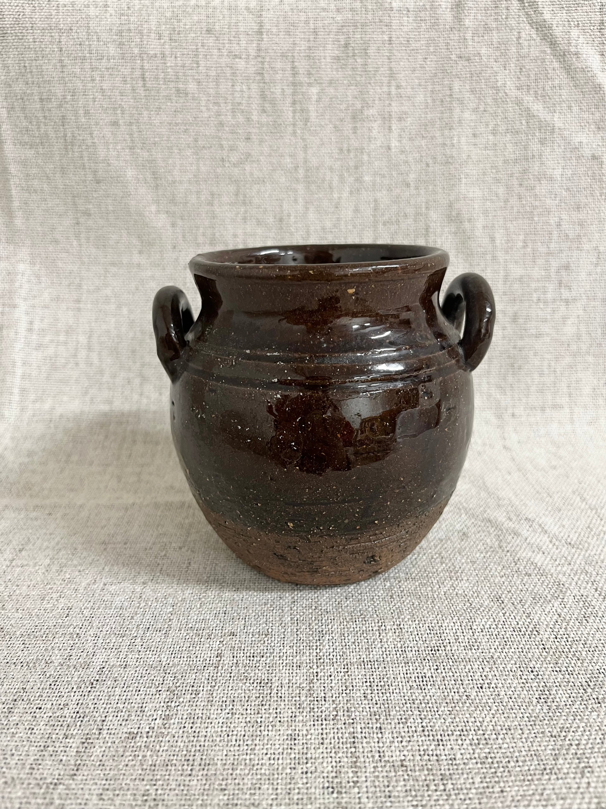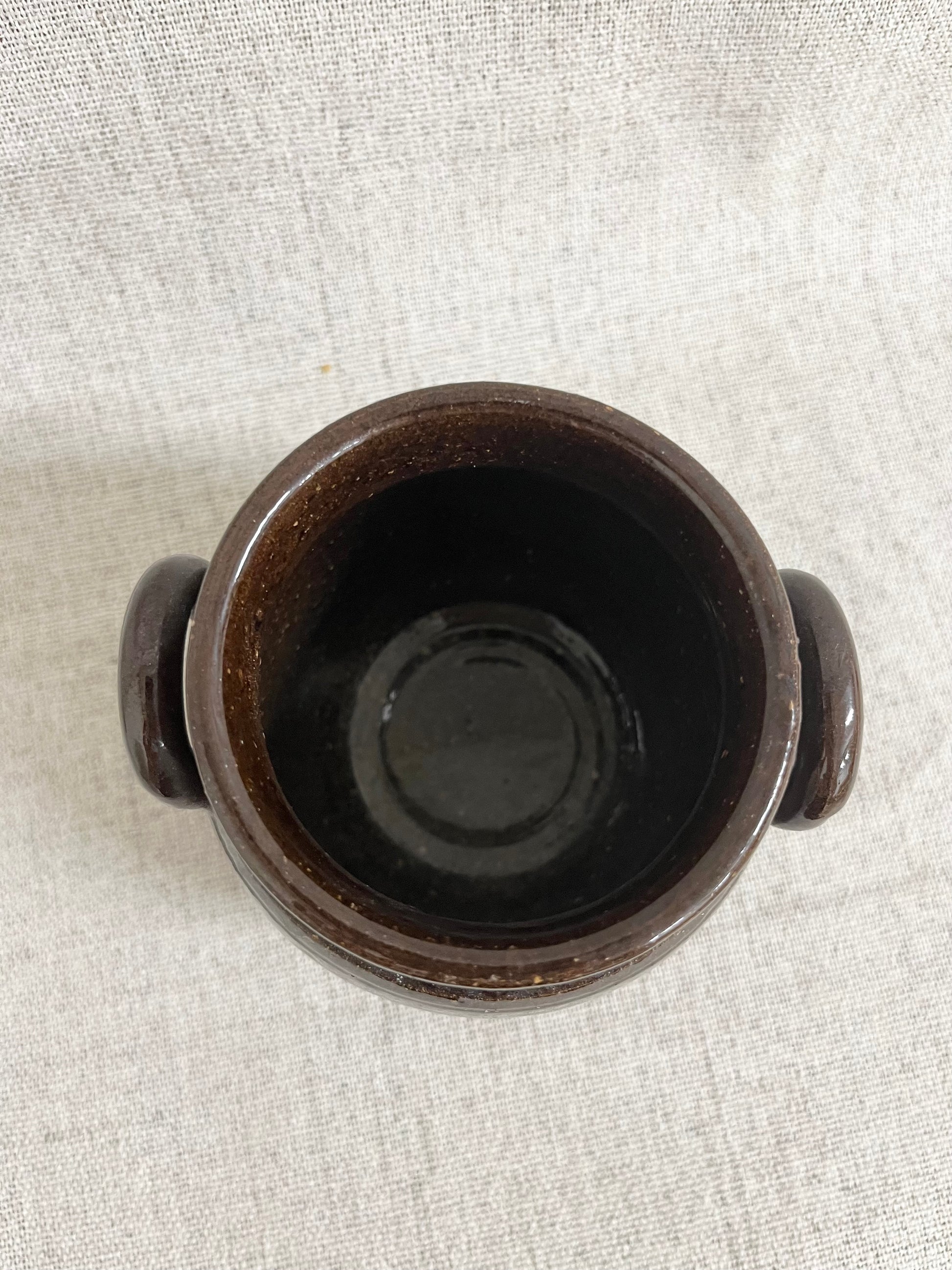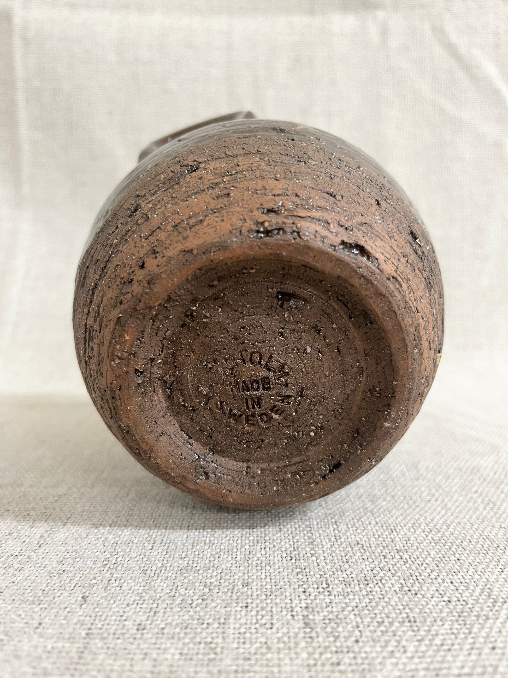 Details: Vintage Laholm Keramik stoneware pot in a deep brown glaze with two small side handles and an unglazed textured base. The rich glaze has natural variations that highlight the rustic character of the clay. Stamped “Laholm Made in Sweden” underneath. A versatile piece that works well as a small vase, a utensil holder, or simply as a decorative accent.