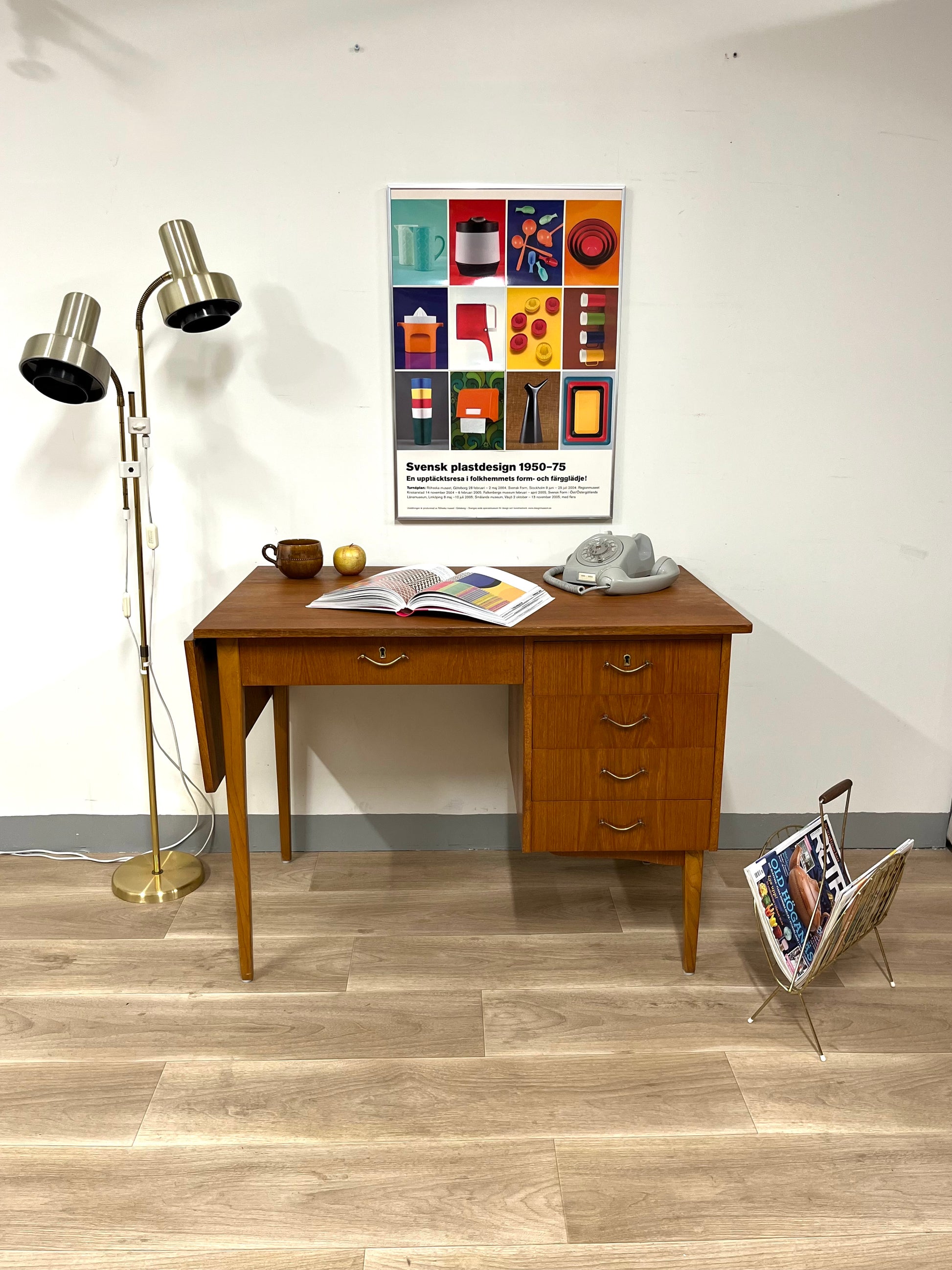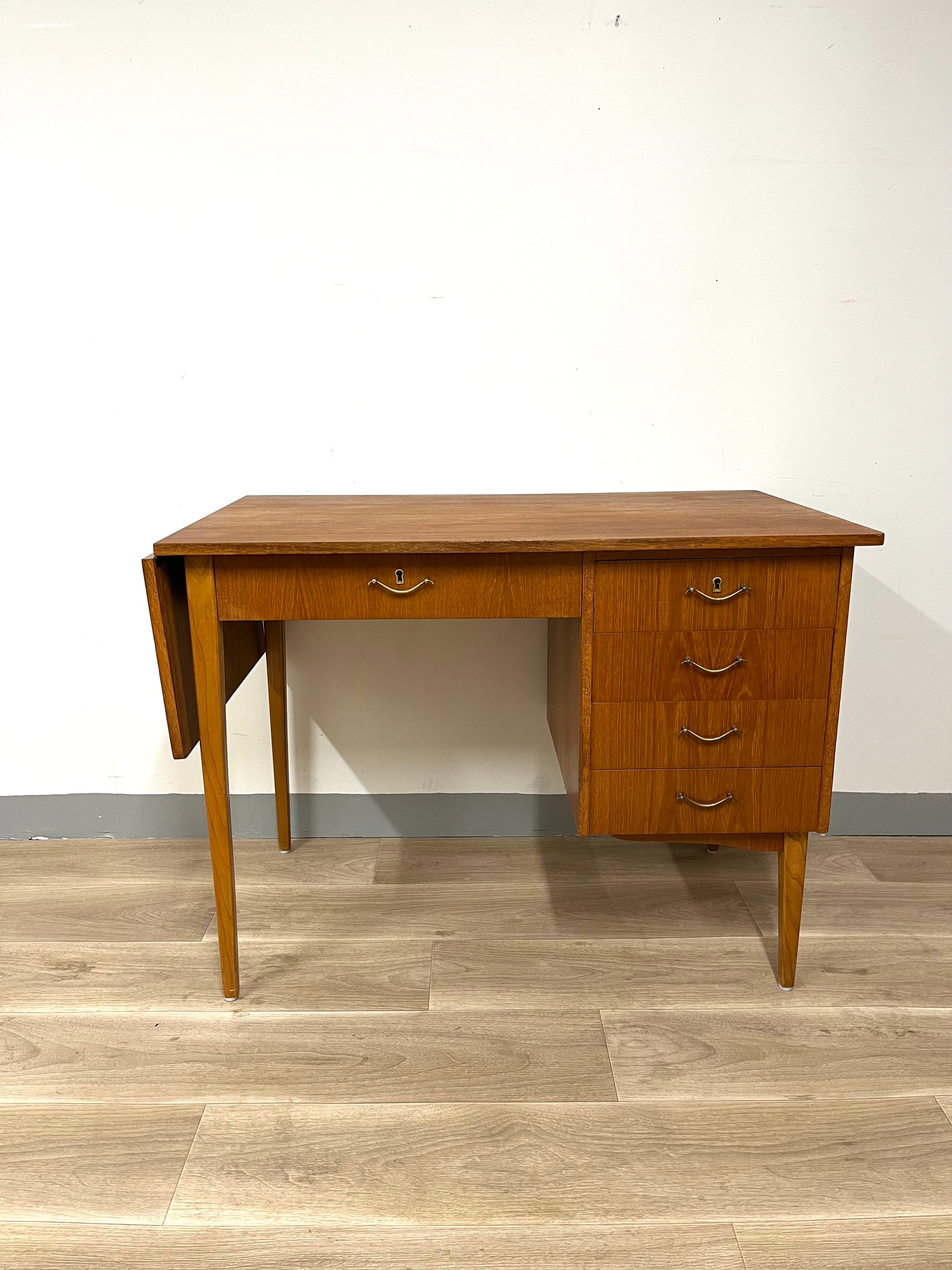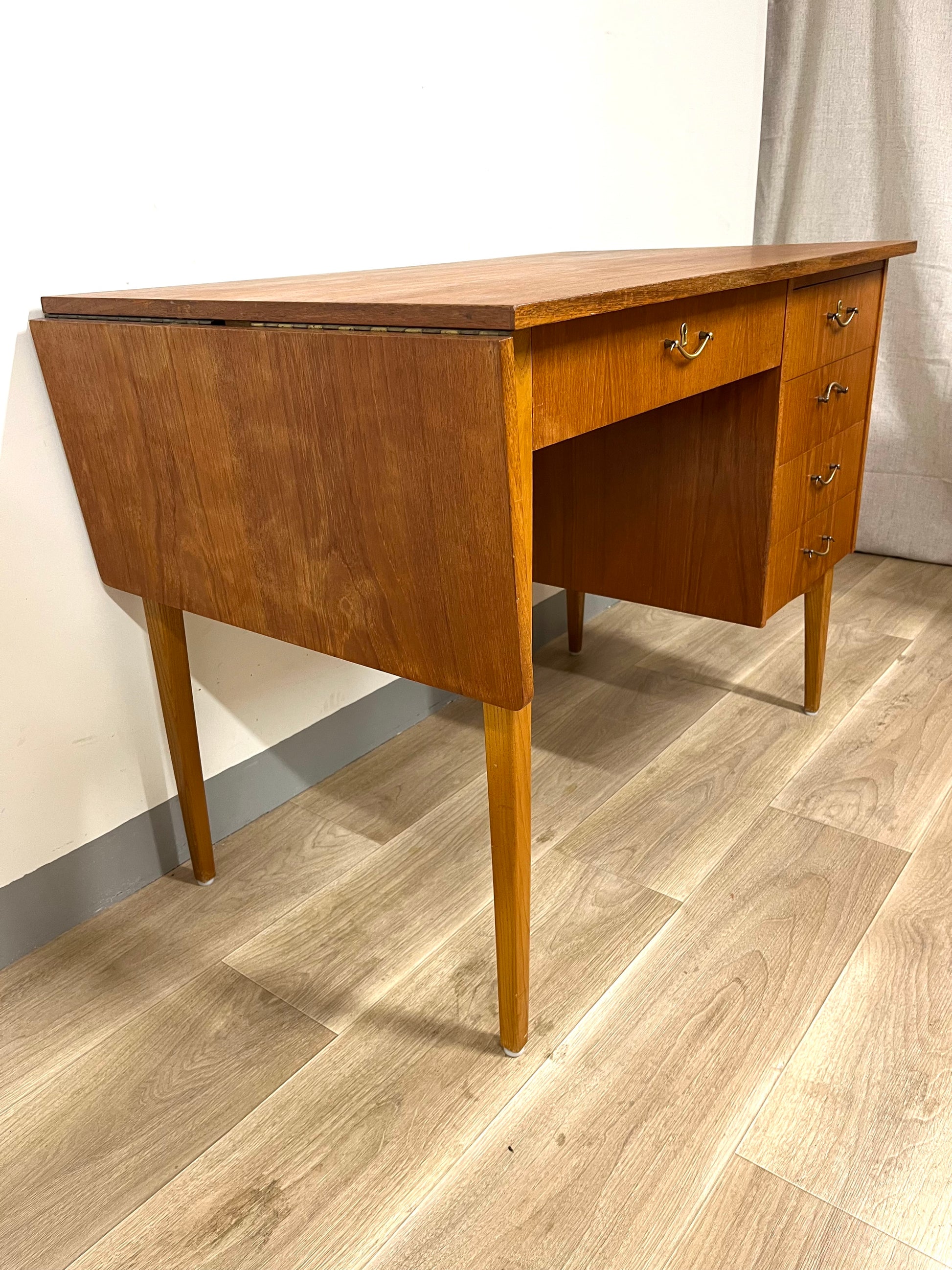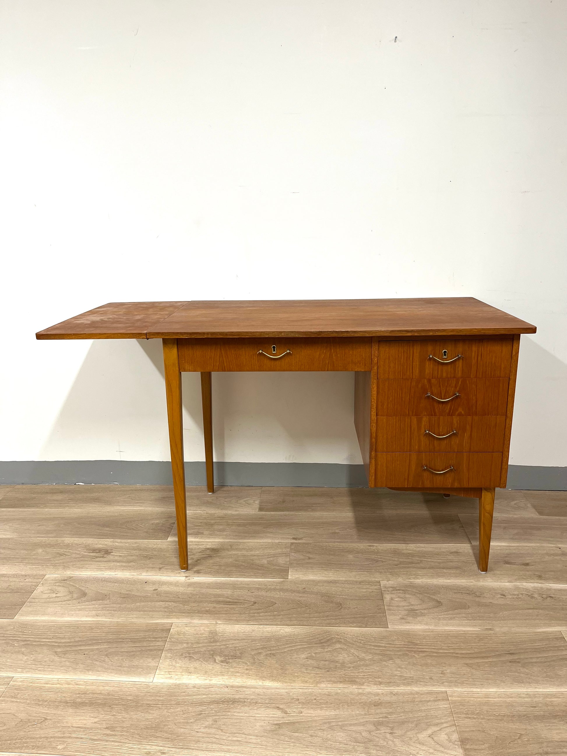 Details: Classic Scandinavian desk with clean lines, four drawers on the right side, and a foldable leaf that extends the work surface when needed. Original brass handles and tapered legs highlight its refined 1950s design.