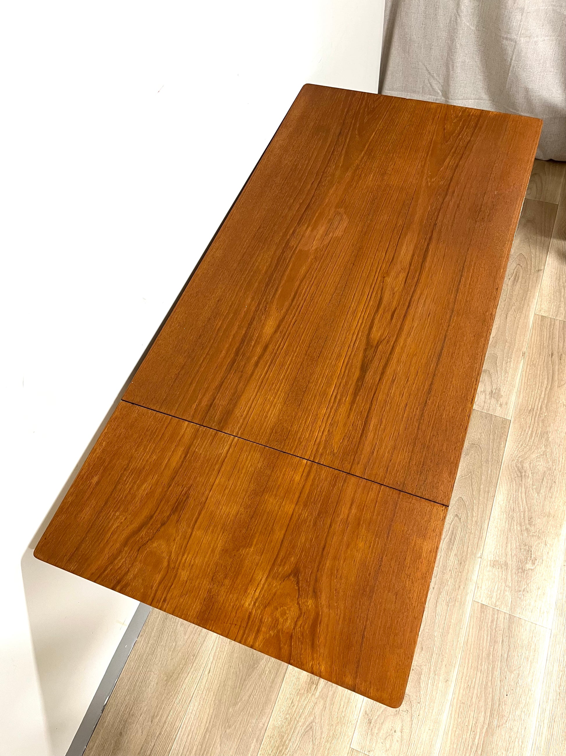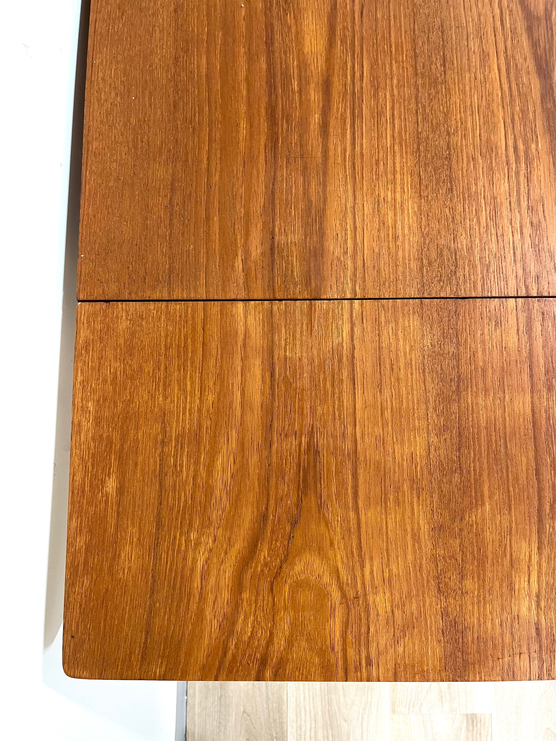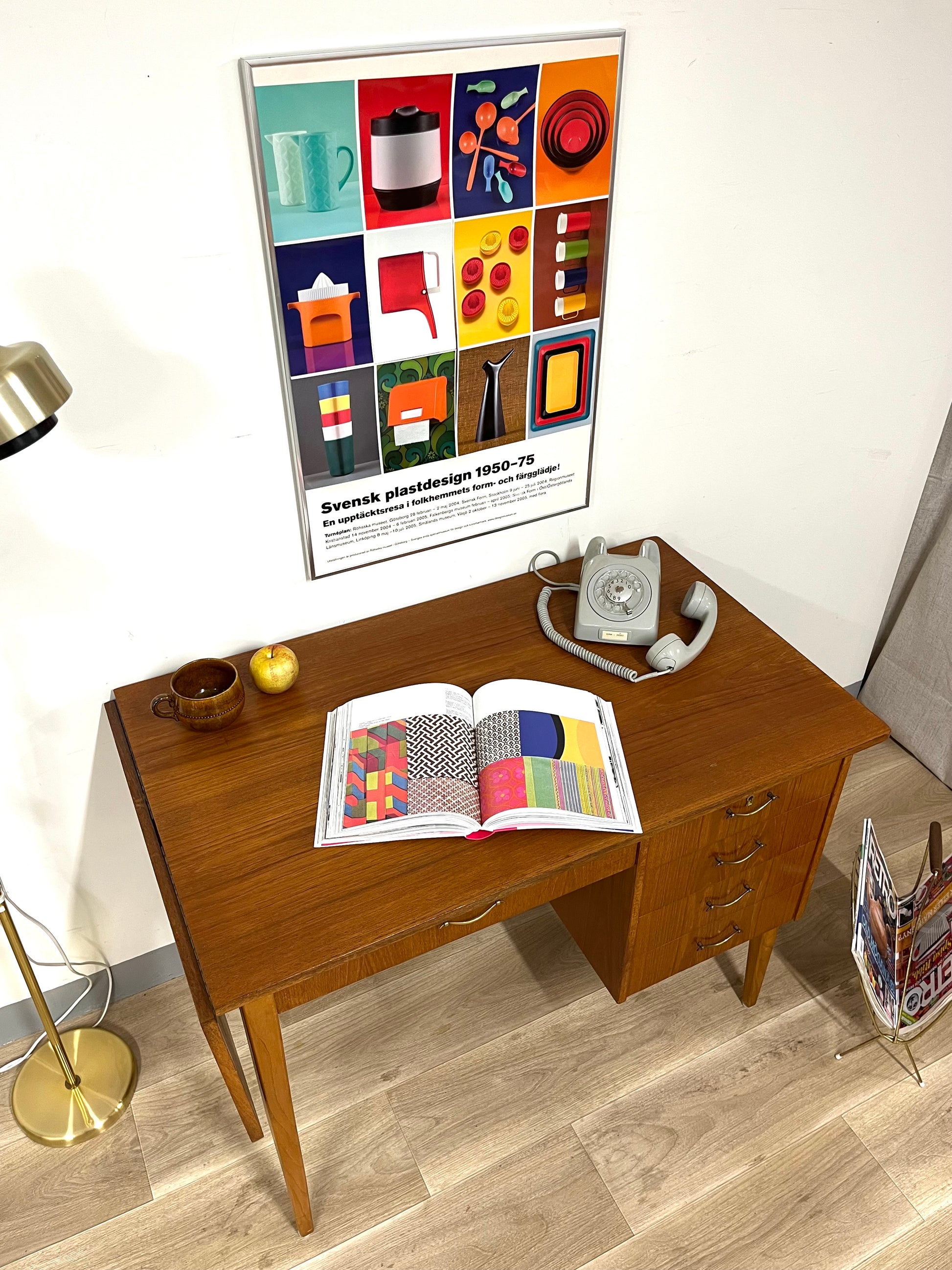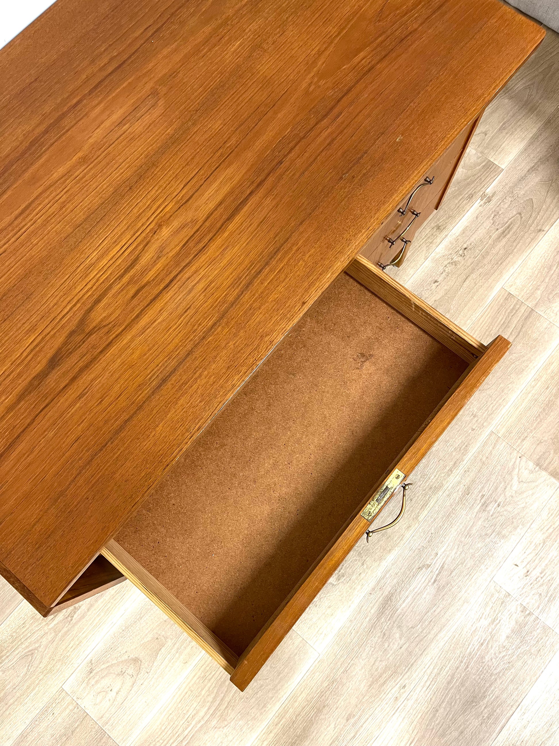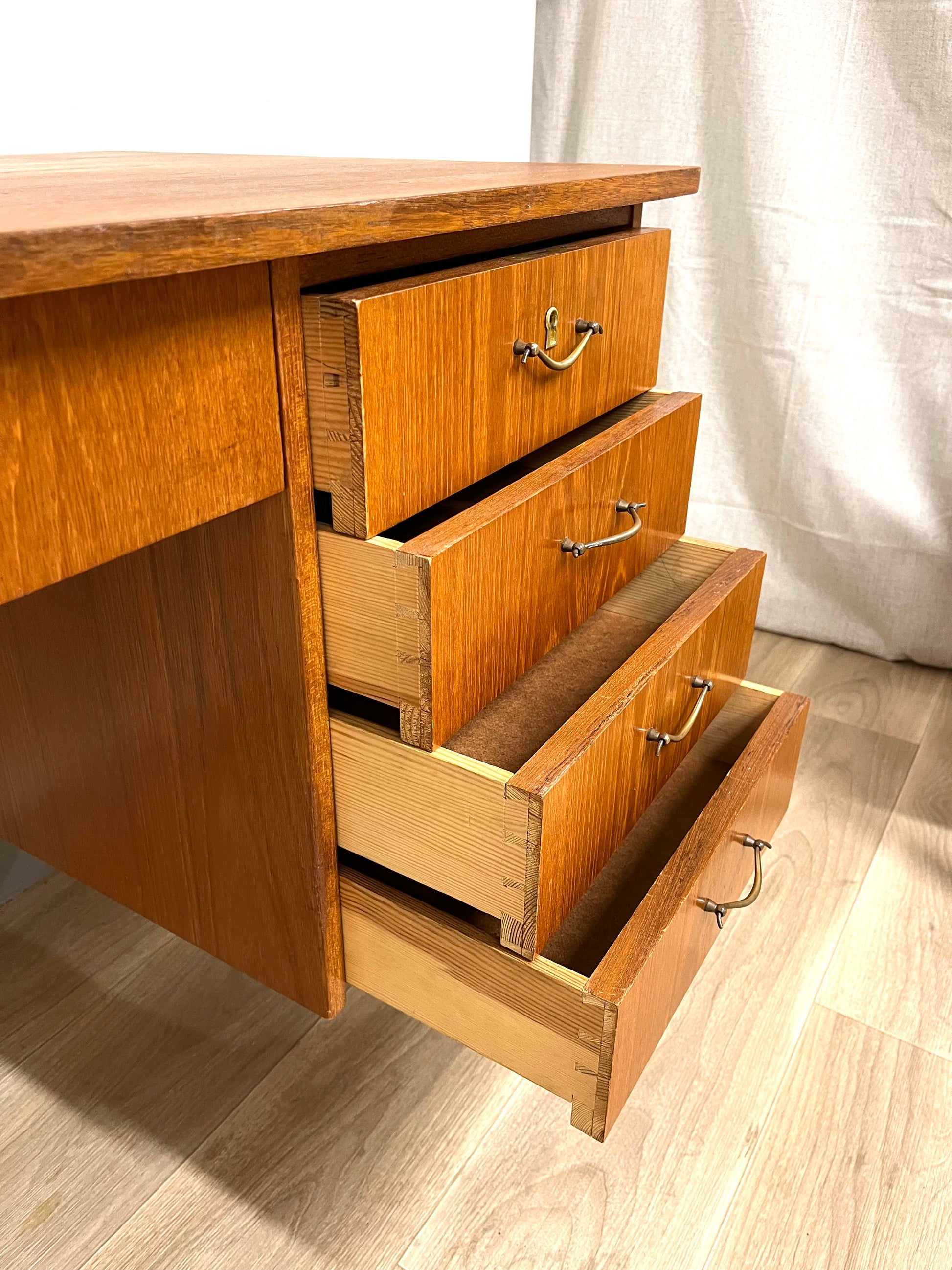 Details: Classic Scandinavian desk with clean lines, four drawers on the right side, and a foldable leaf that extends the work surface when needed. Original brass handles and tapered legs highlight its refined 1950s design.