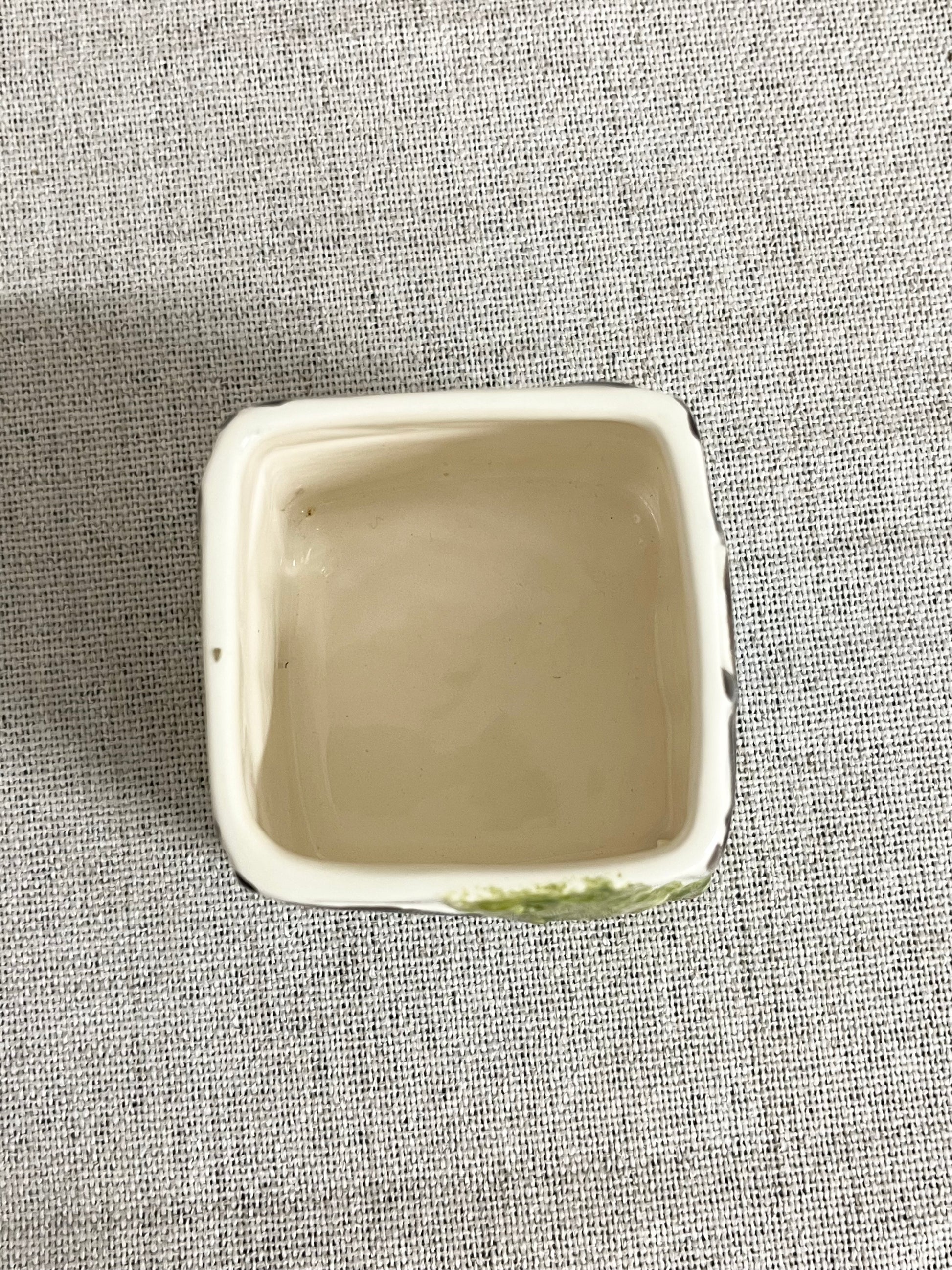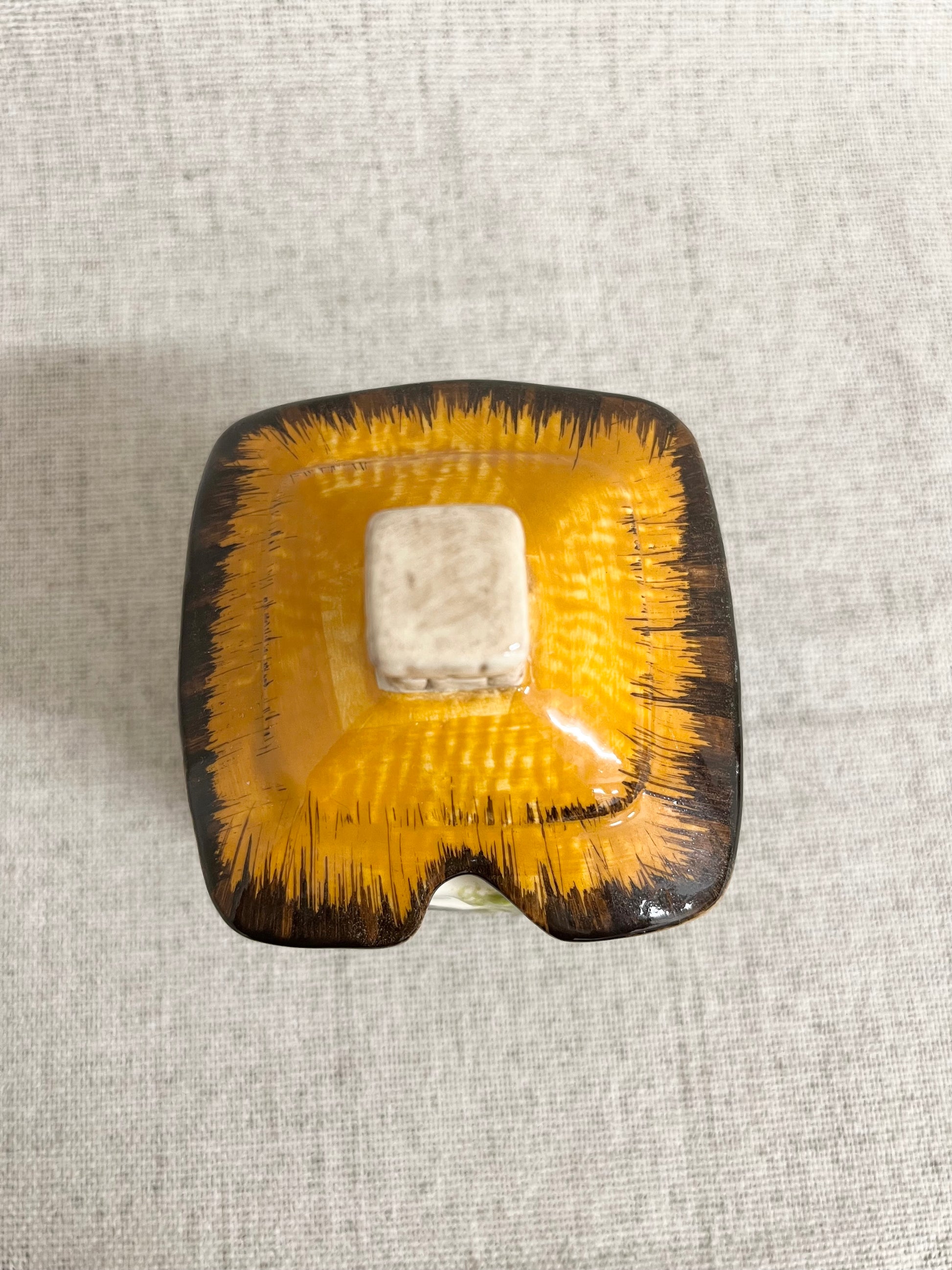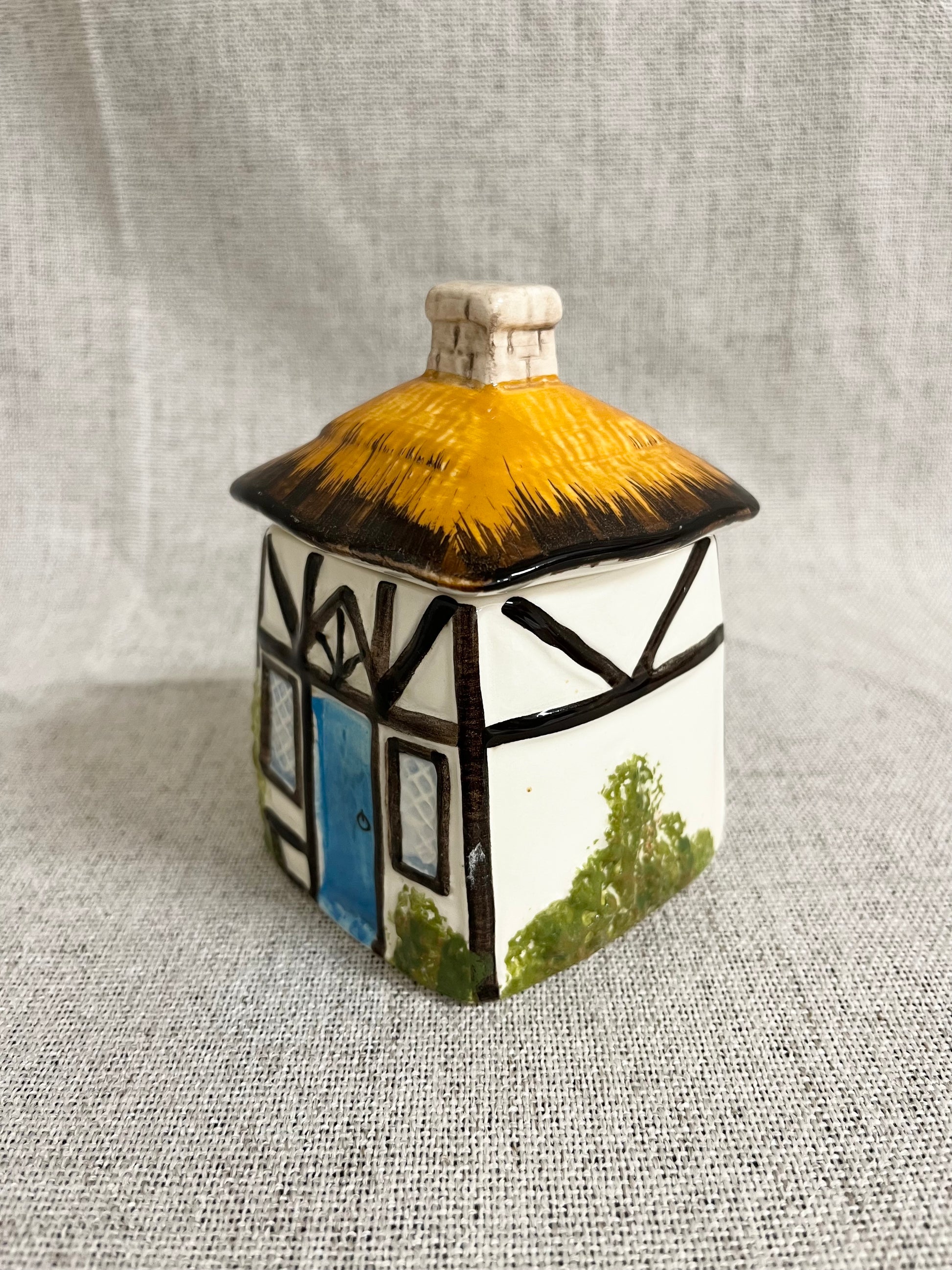 Details: Hand painted lidded pot shaped as a traditional English thatched cottage, made by Babbacombe Pottery in Devon. Features a bright blue door, timber frame detailing, and a removable roof lid. A charming and collectible piece that works as a small functional jar or as decorative cottageware.