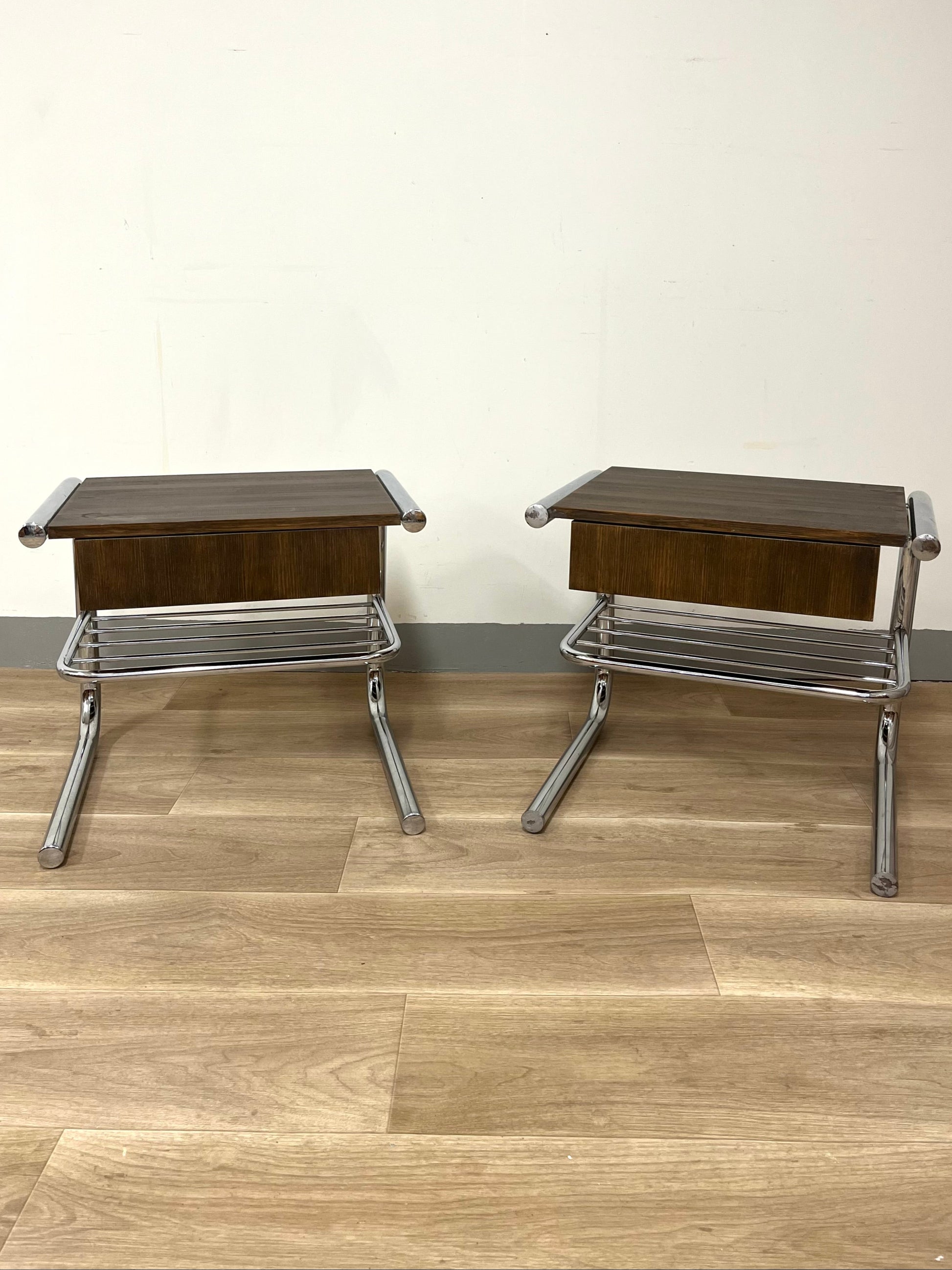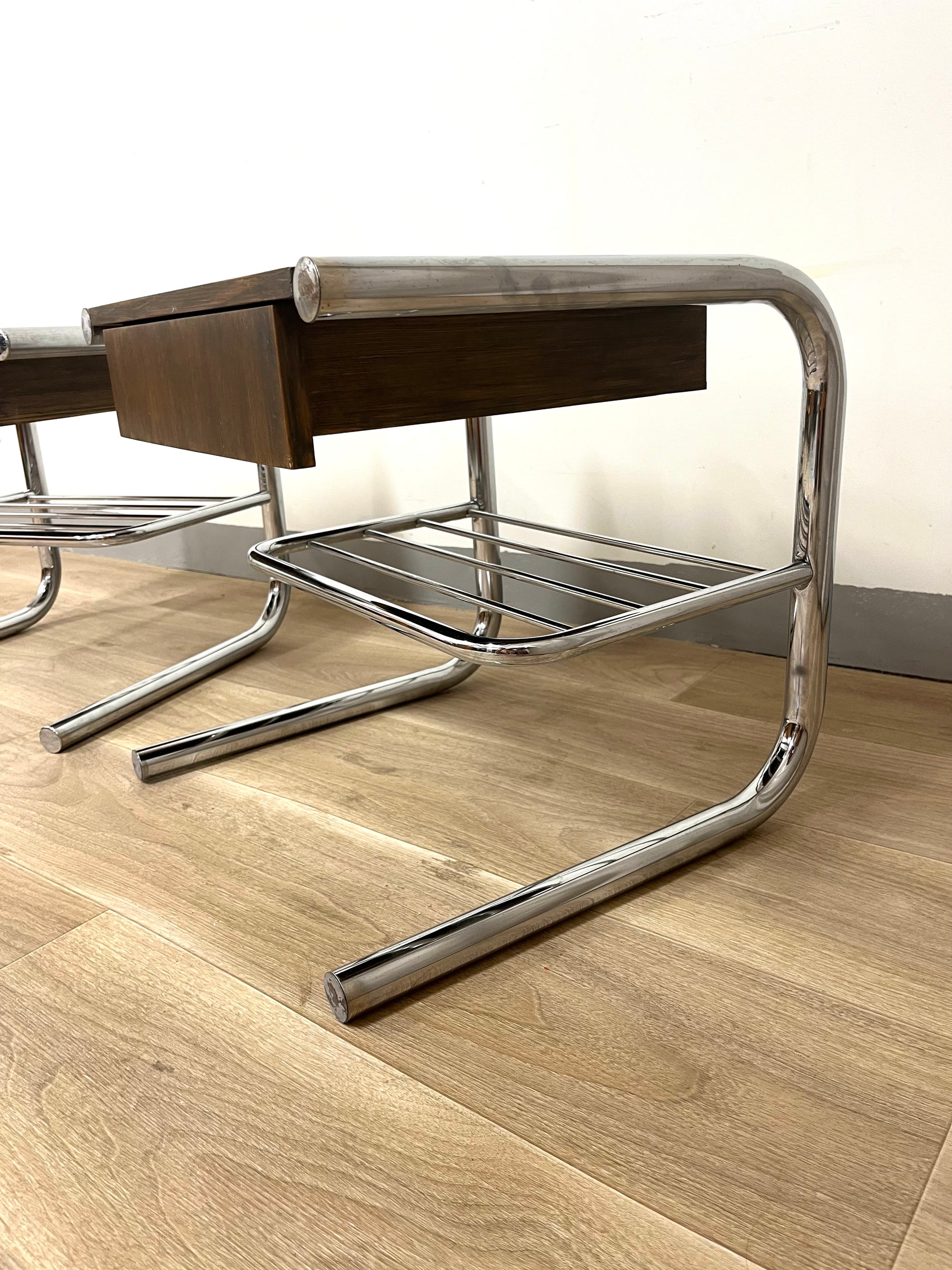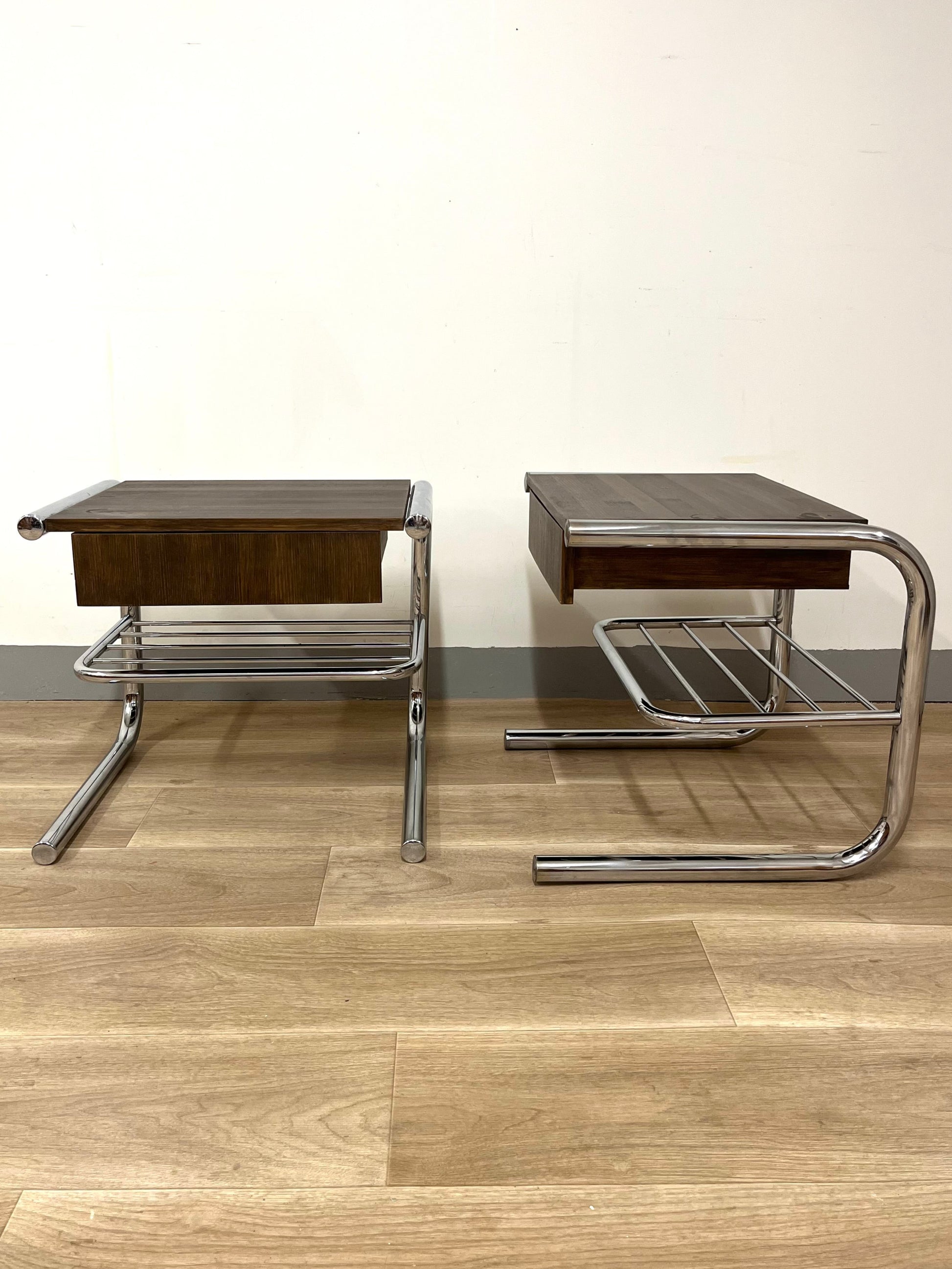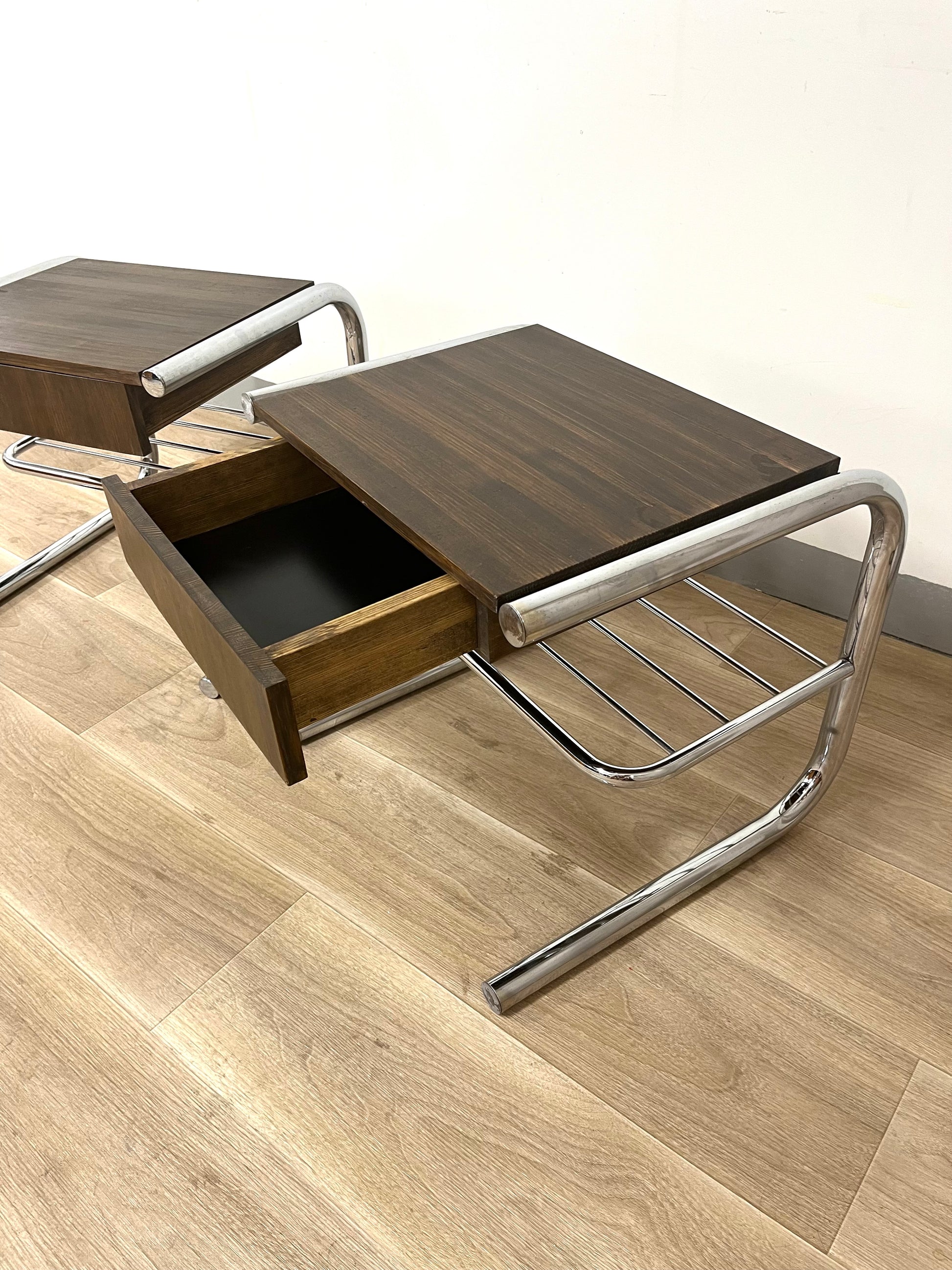 Original tubular chrome frames from the 1970s combined with solid wooden drawer sections, built later by a previous owner and stained in a warm dark brown. Each table features a drawer and a lower rack for magazines or books. Light wear and patina consistent with age.