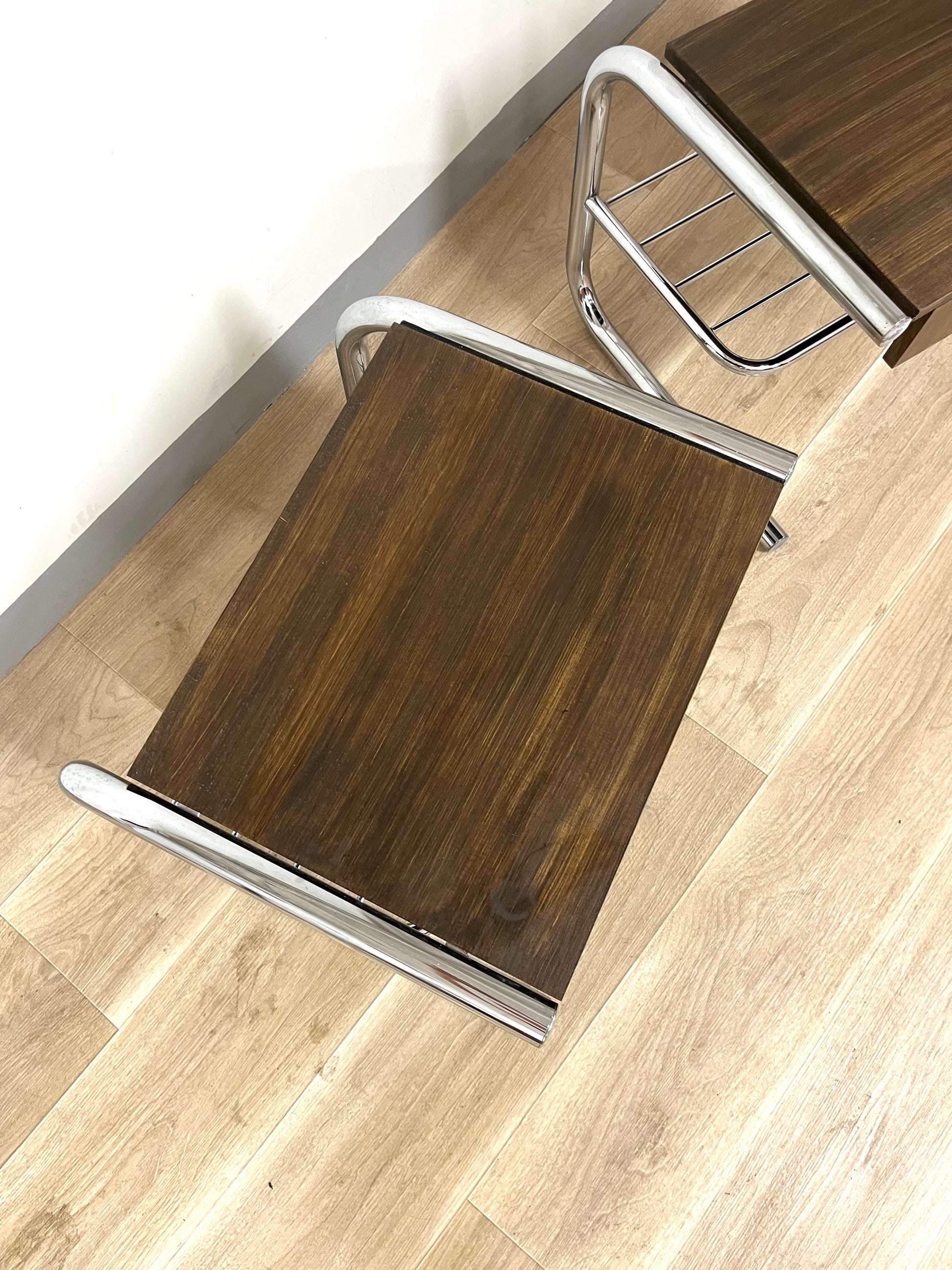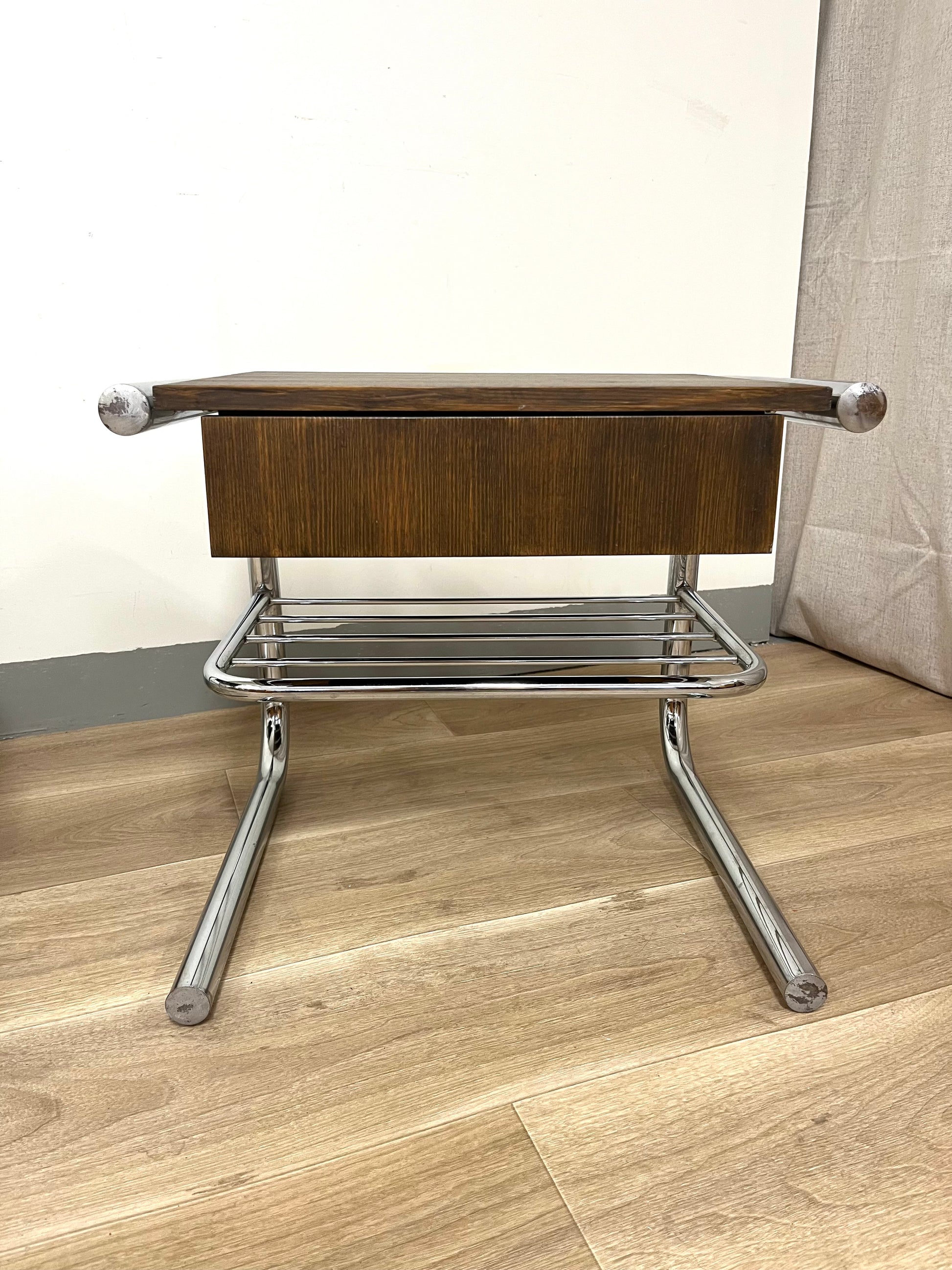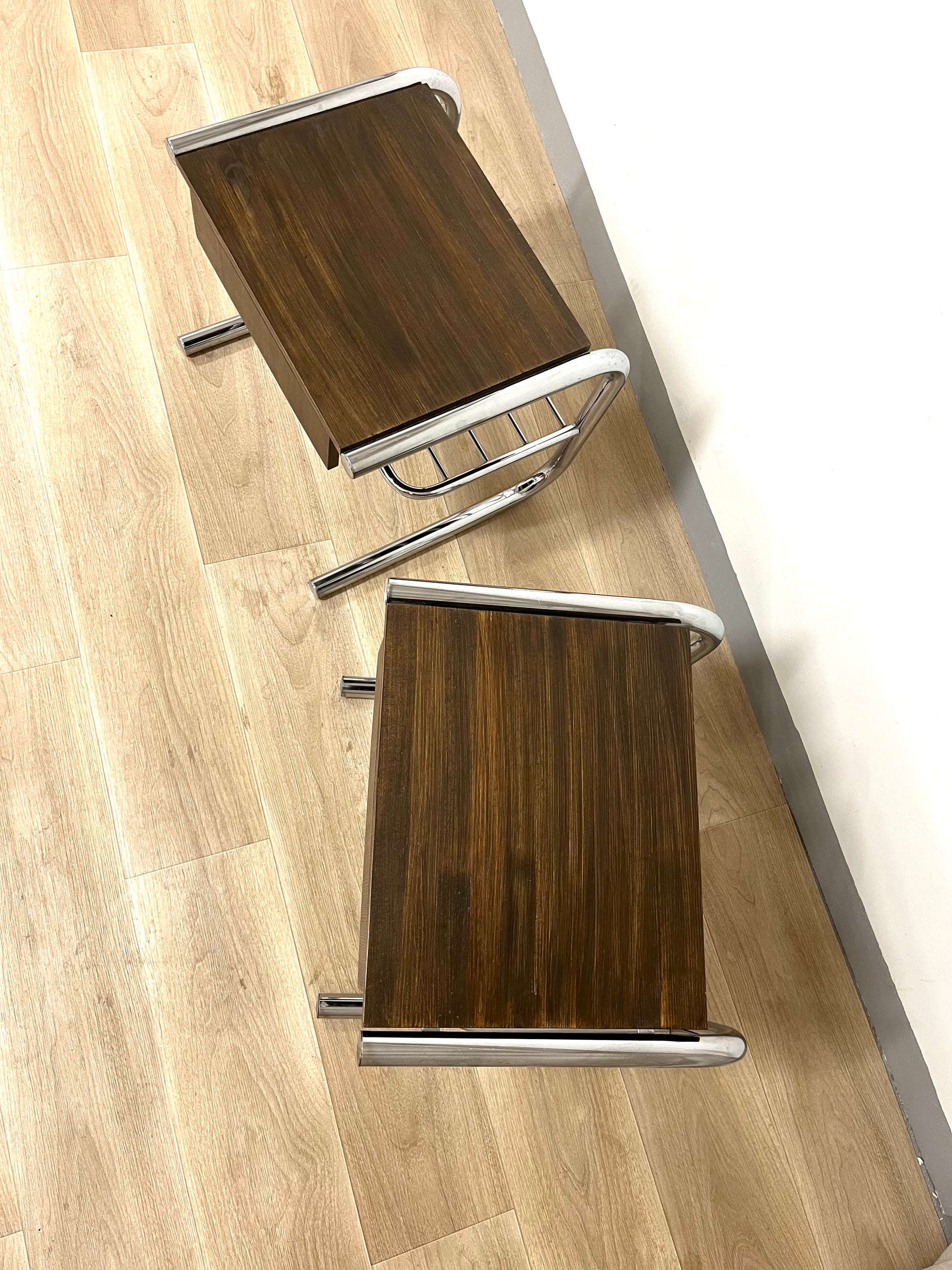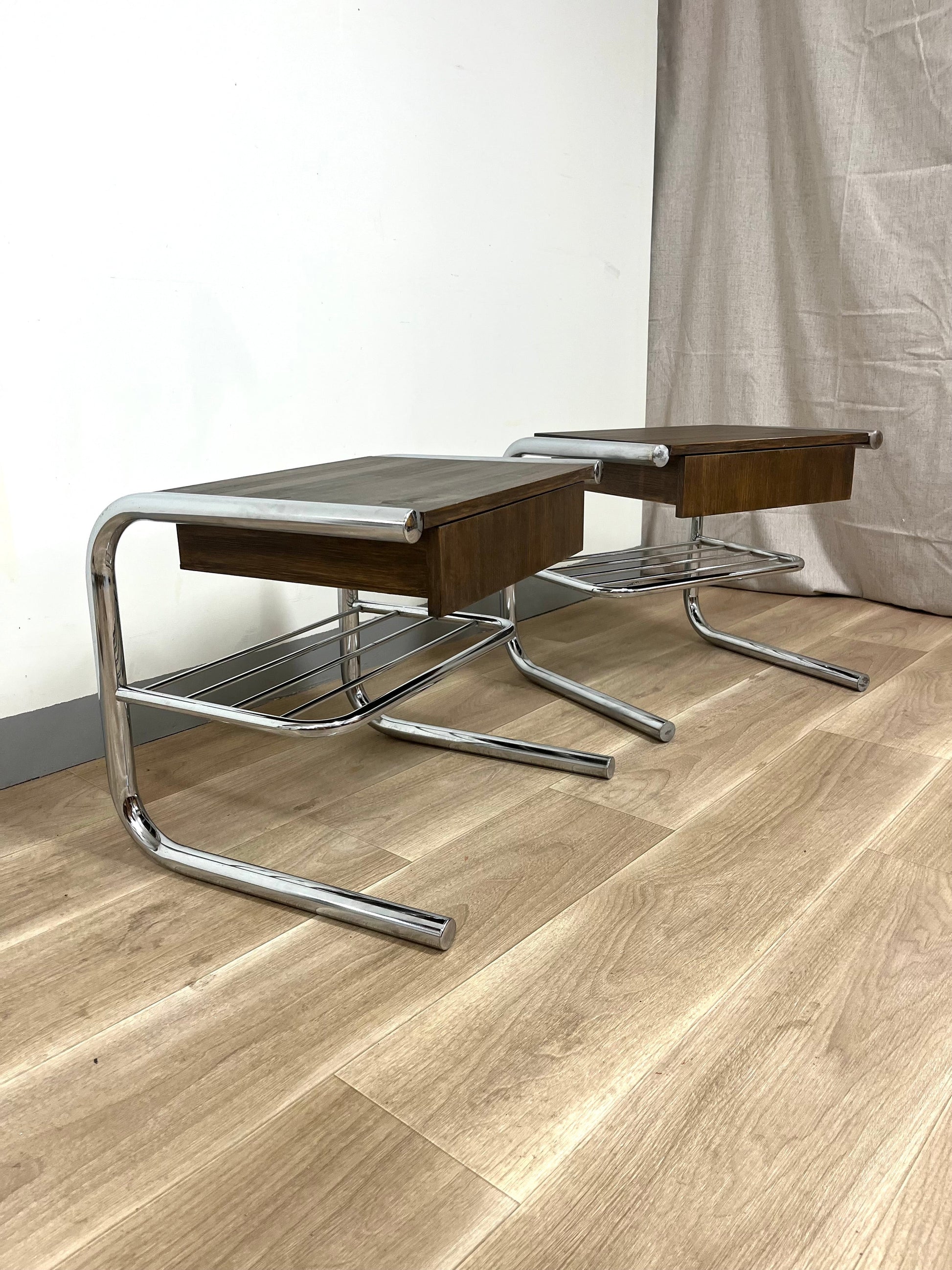 Original tubular chrome frames from the 1970s combined with solid wooden drawer sections, built later by a previous owner and stained in a warm dark brown. Each table features a drawer and a lower rack for magazines or books. Light wear and patina consistent with age.