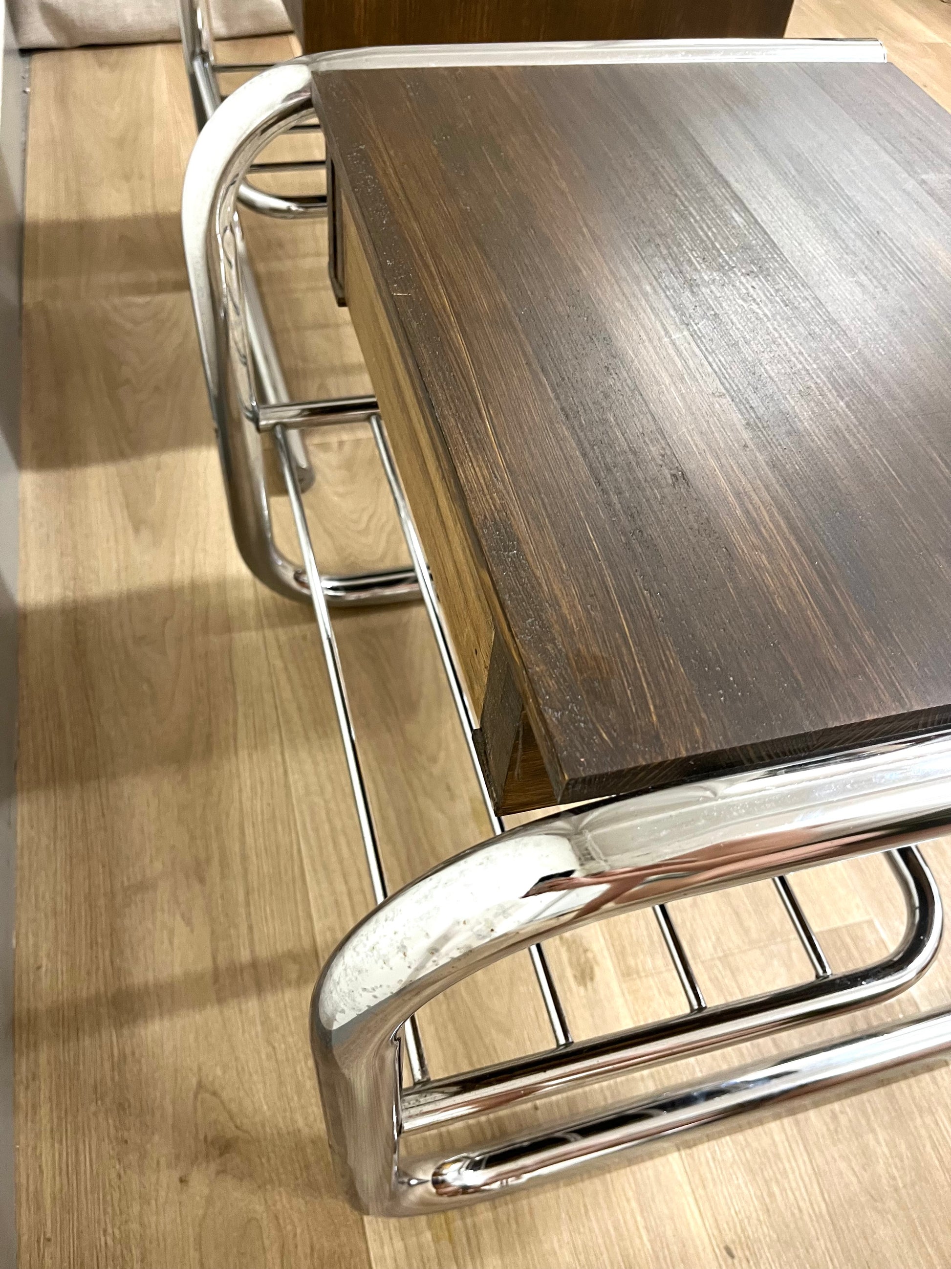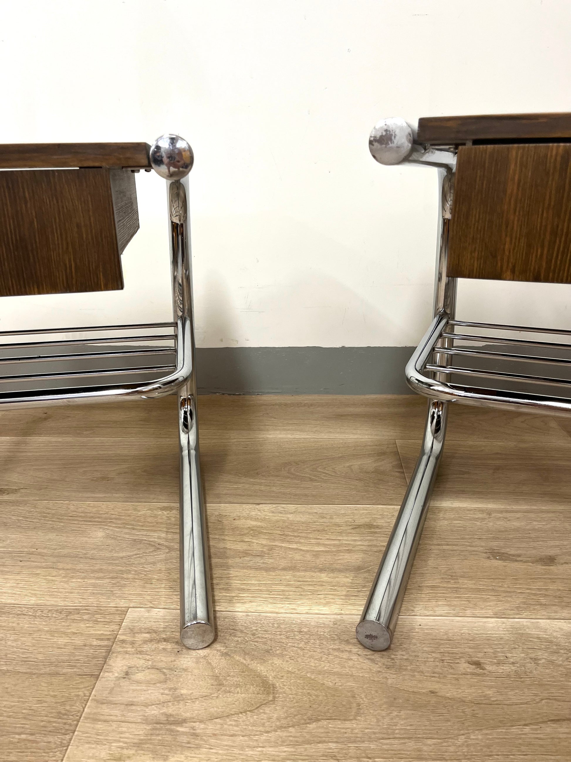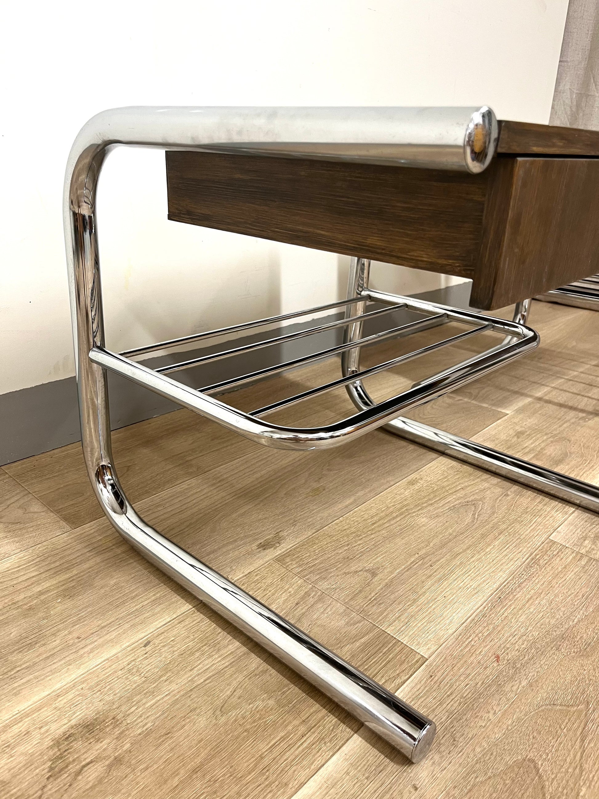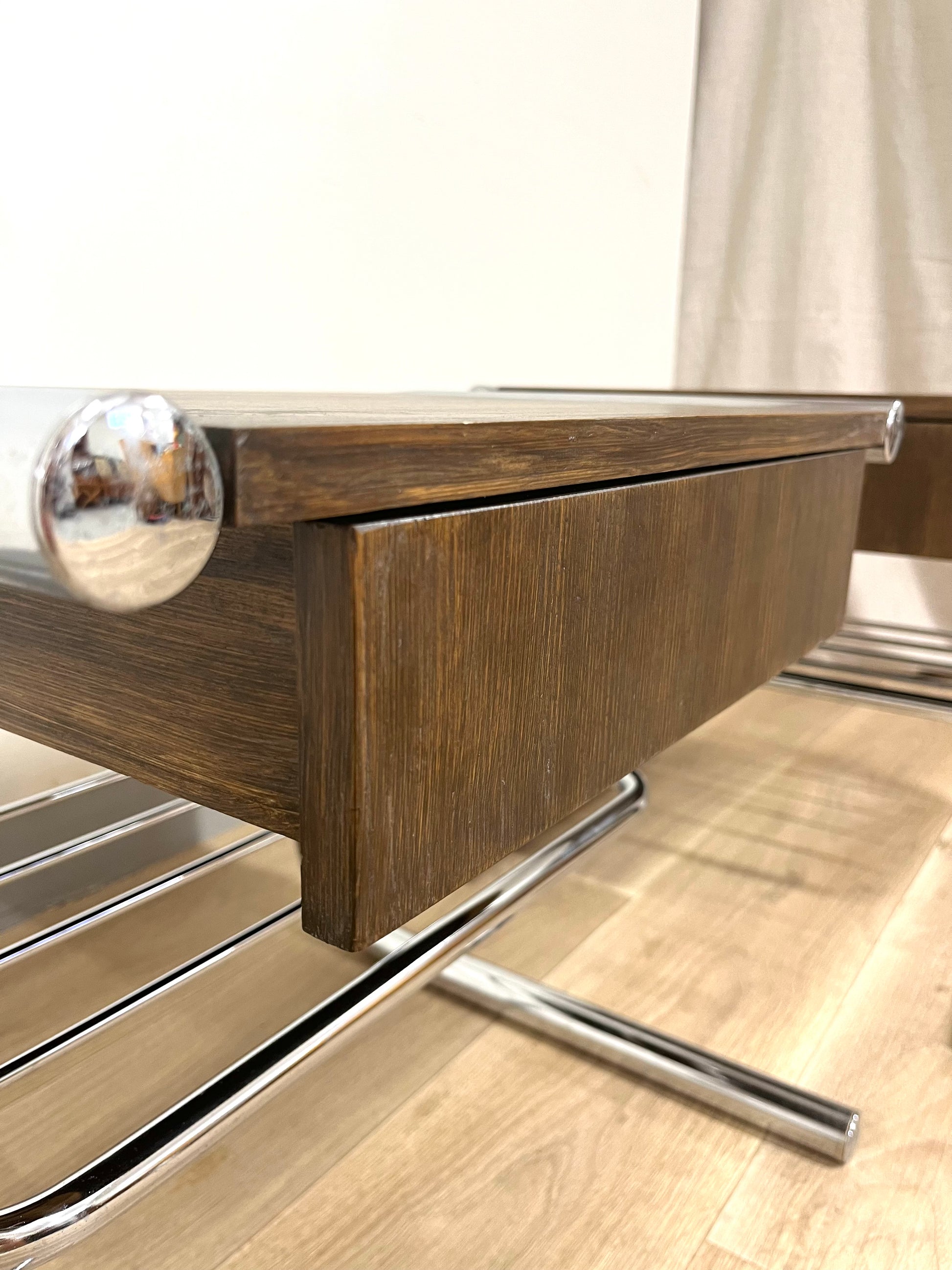 Original tubular chrome frames from the 1970s combined with solid wooden drawer sections, built later by a previous owner and stained in a warm dark brown. Each table features a drawer and a lower rack for magazines or books. Light wear and patina consistent with age.