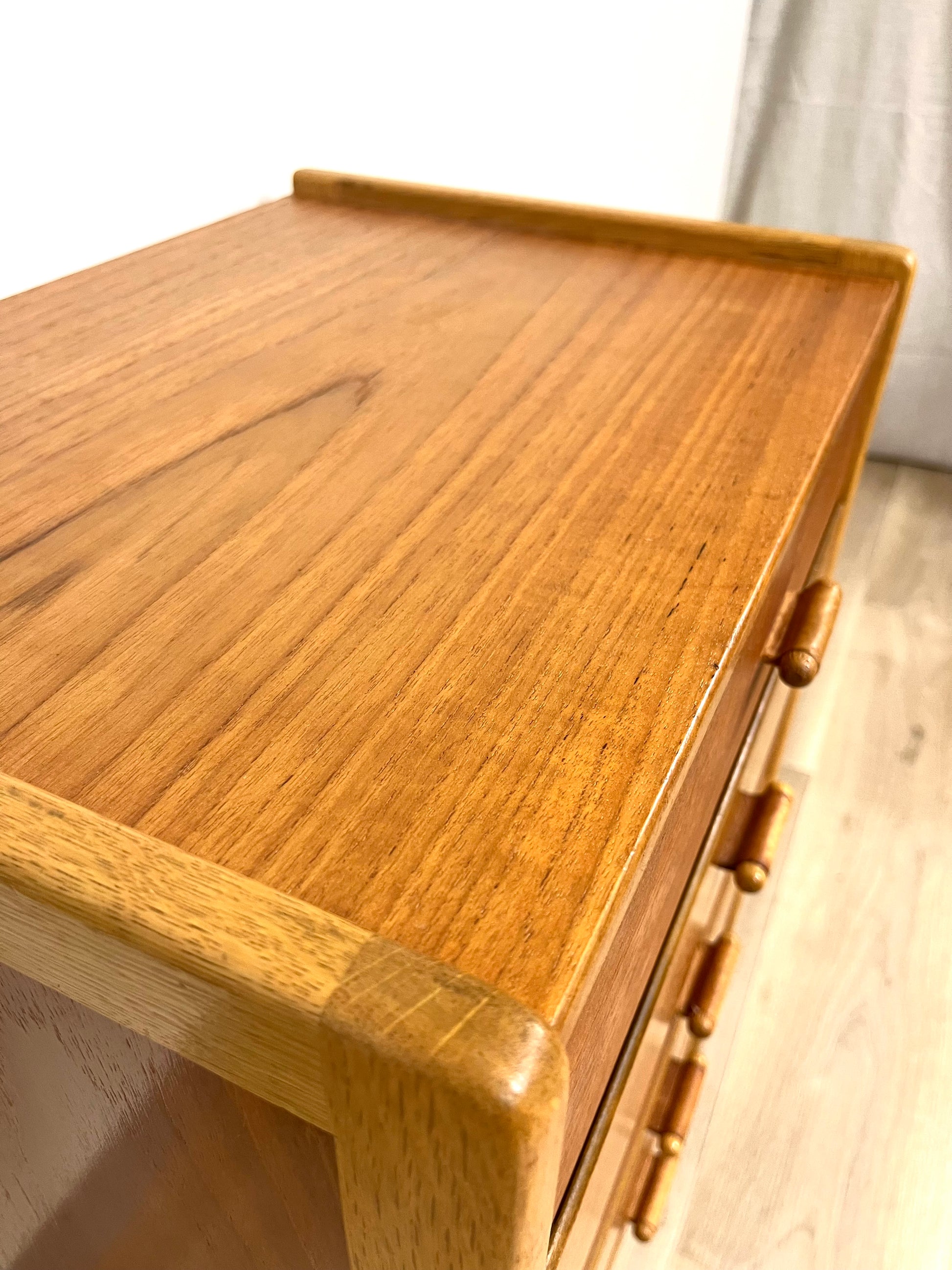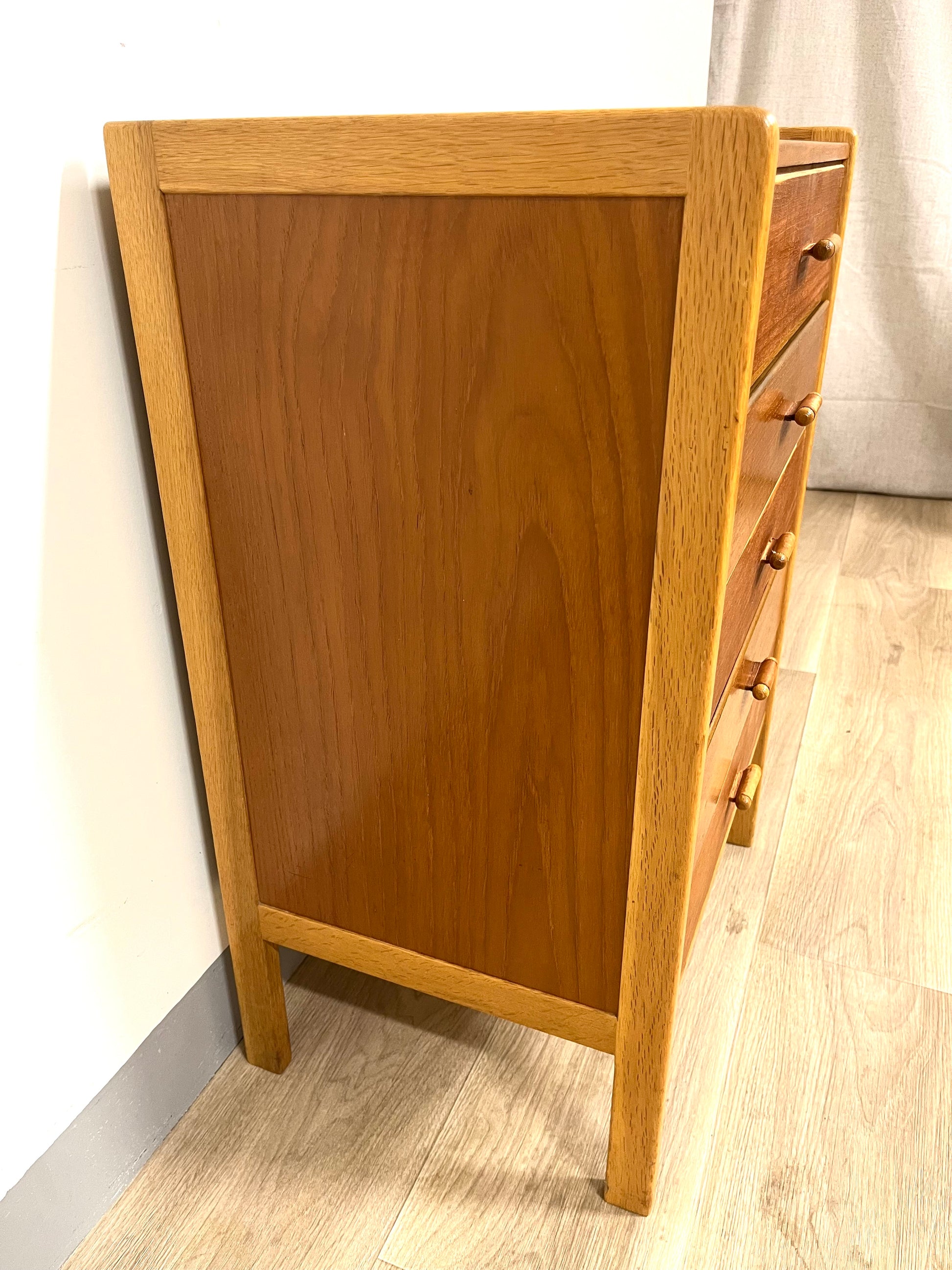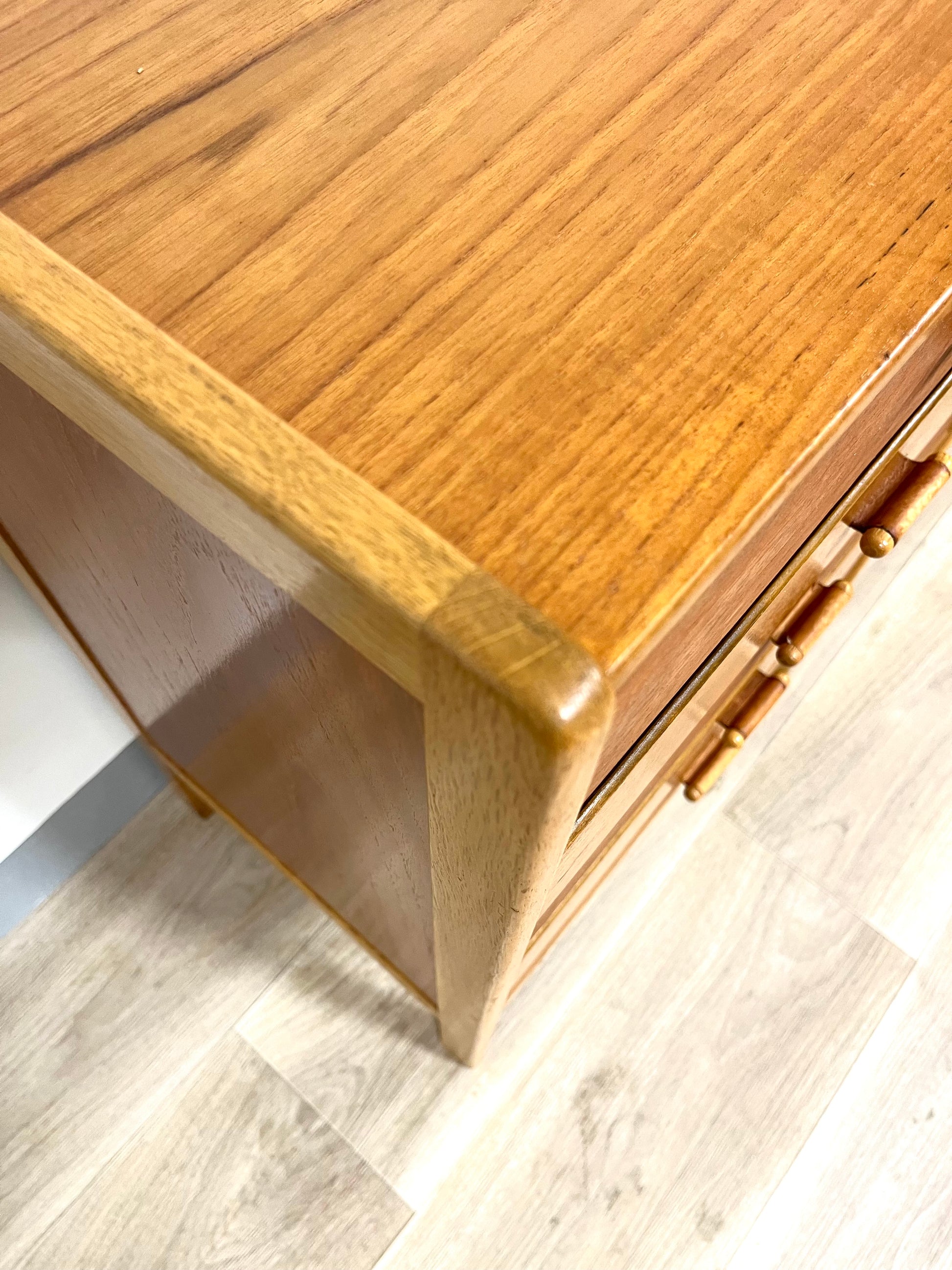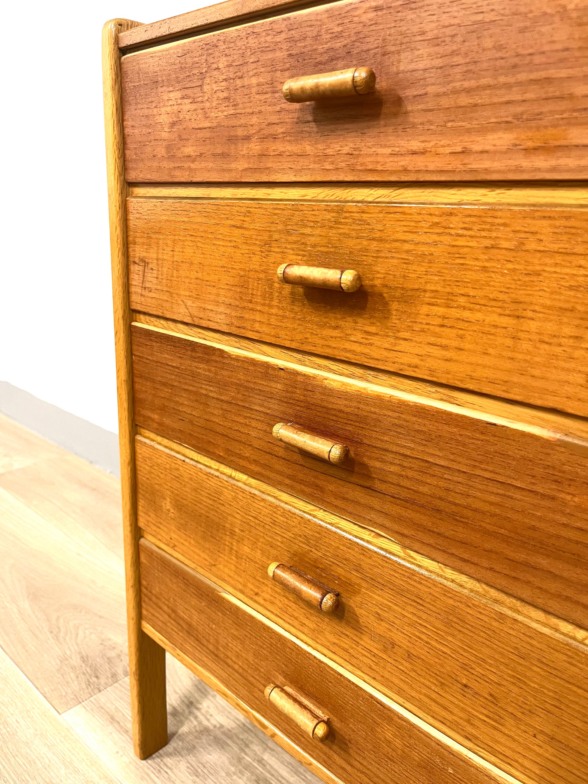 Condition: Good vintage condition. The leather handles show wear but remain functional. Some repairs and light scratches are visible on the drawer fronts.