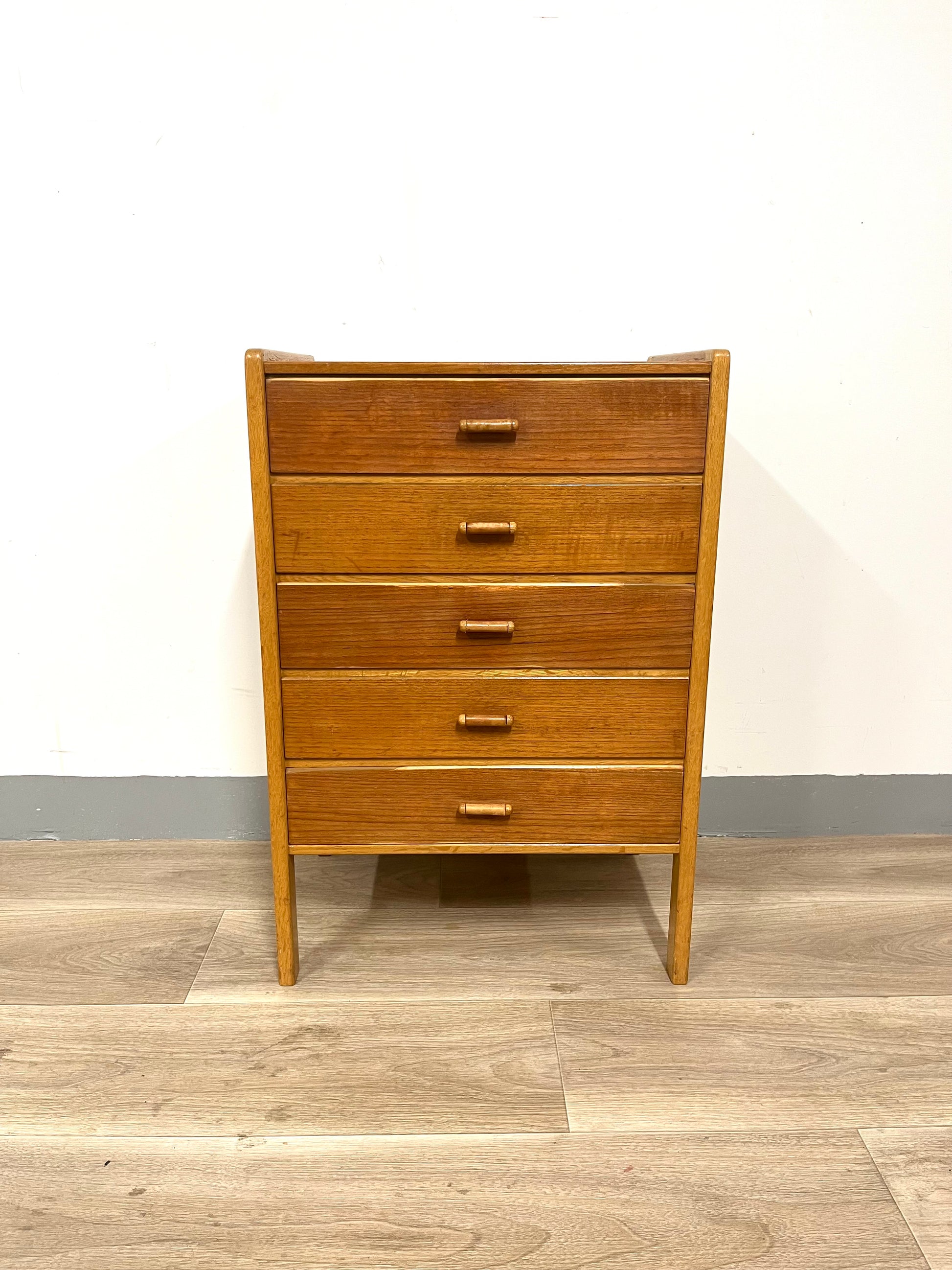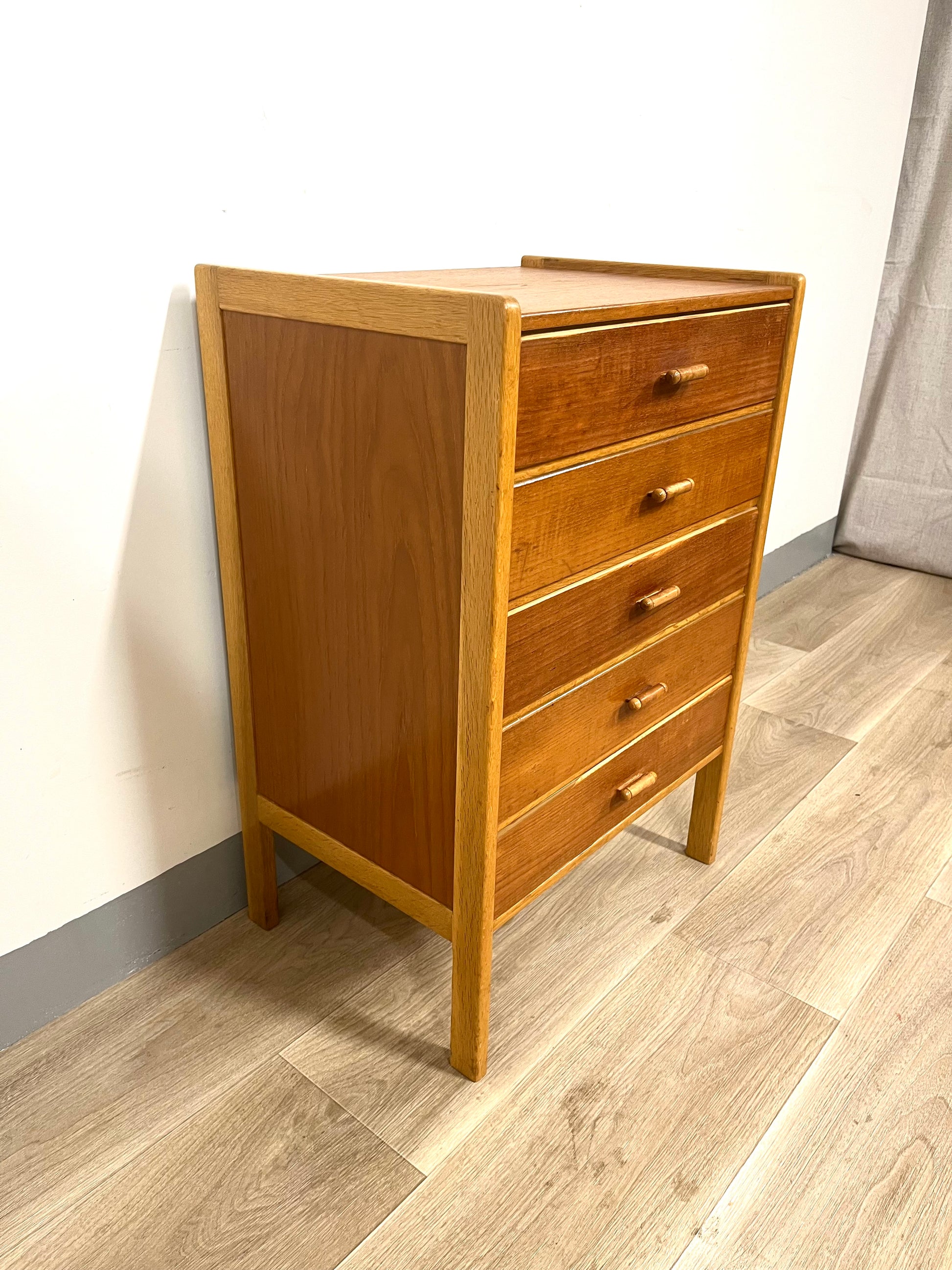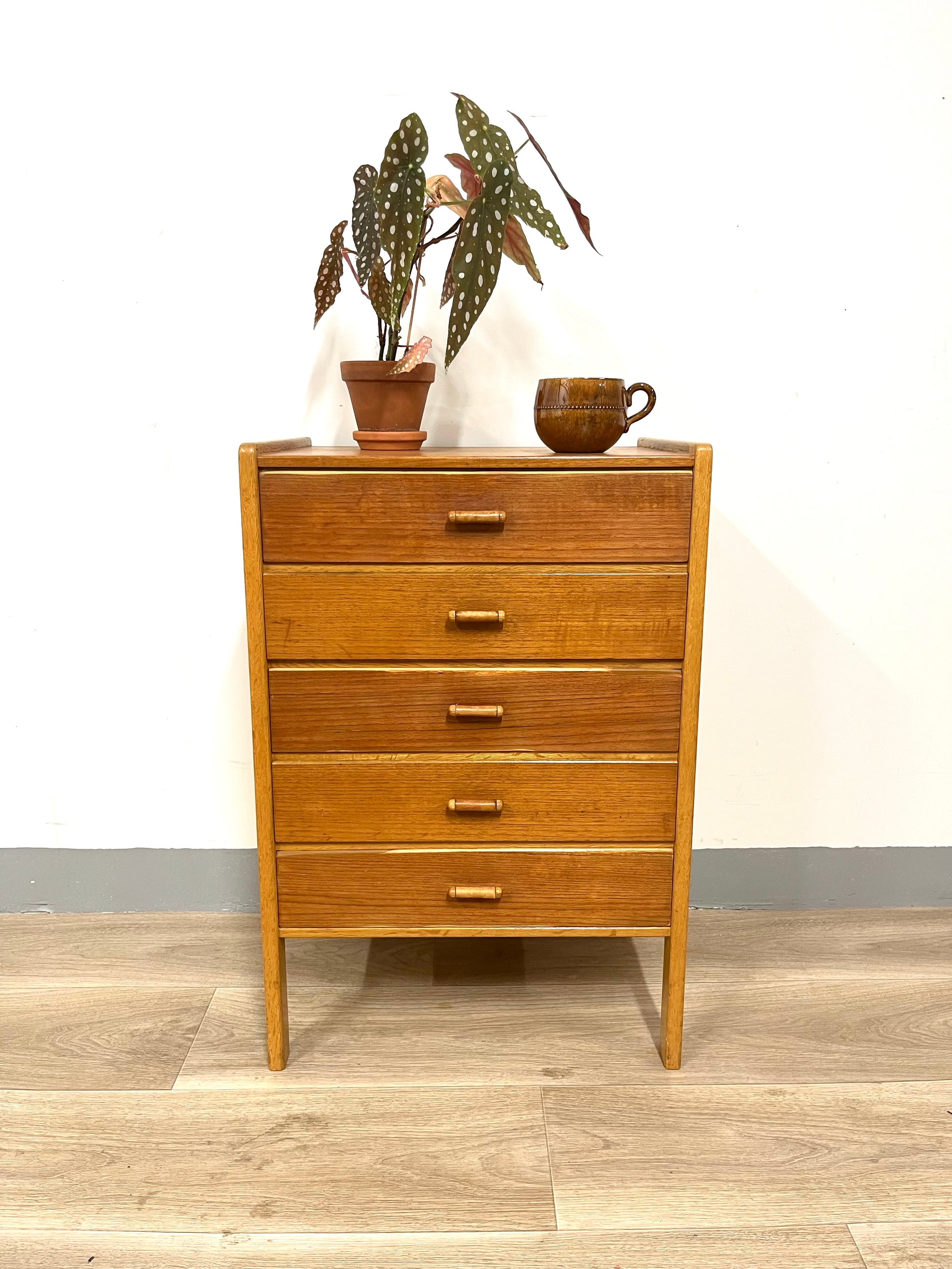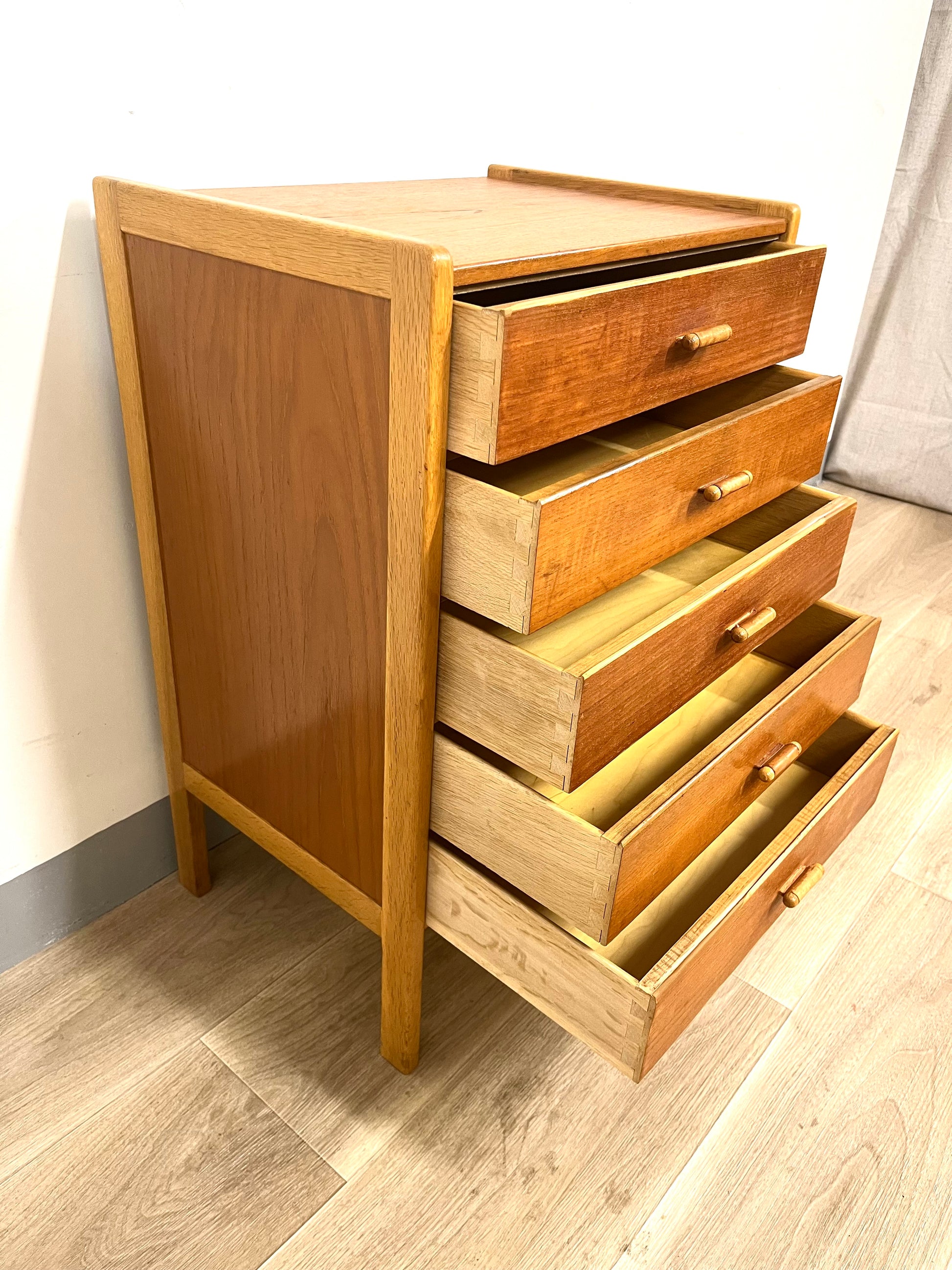 Condition: Good vintage condition. The leather handles show wear but remain functional. Some repairs and light scratches are visible on the drawer fronts.