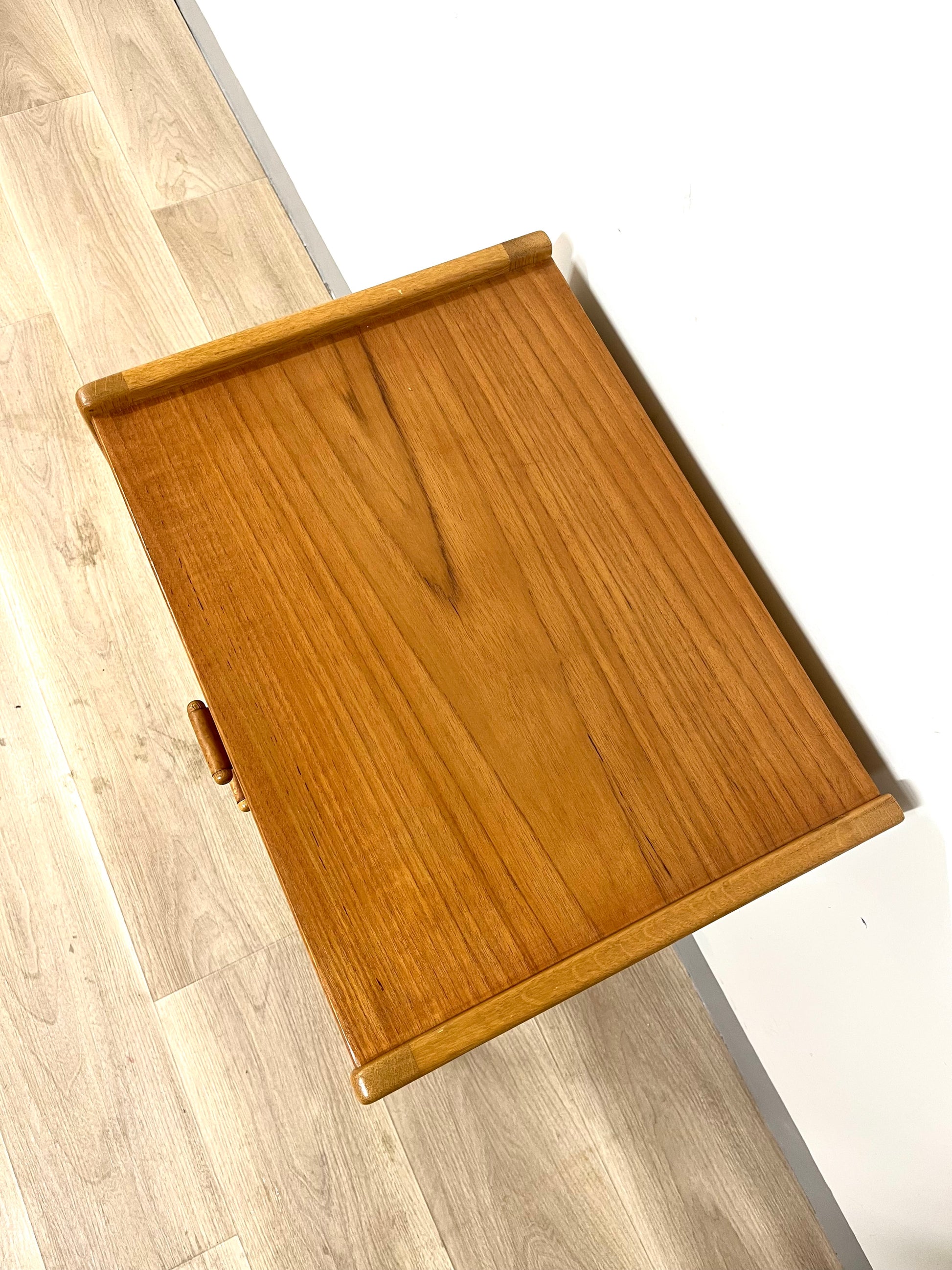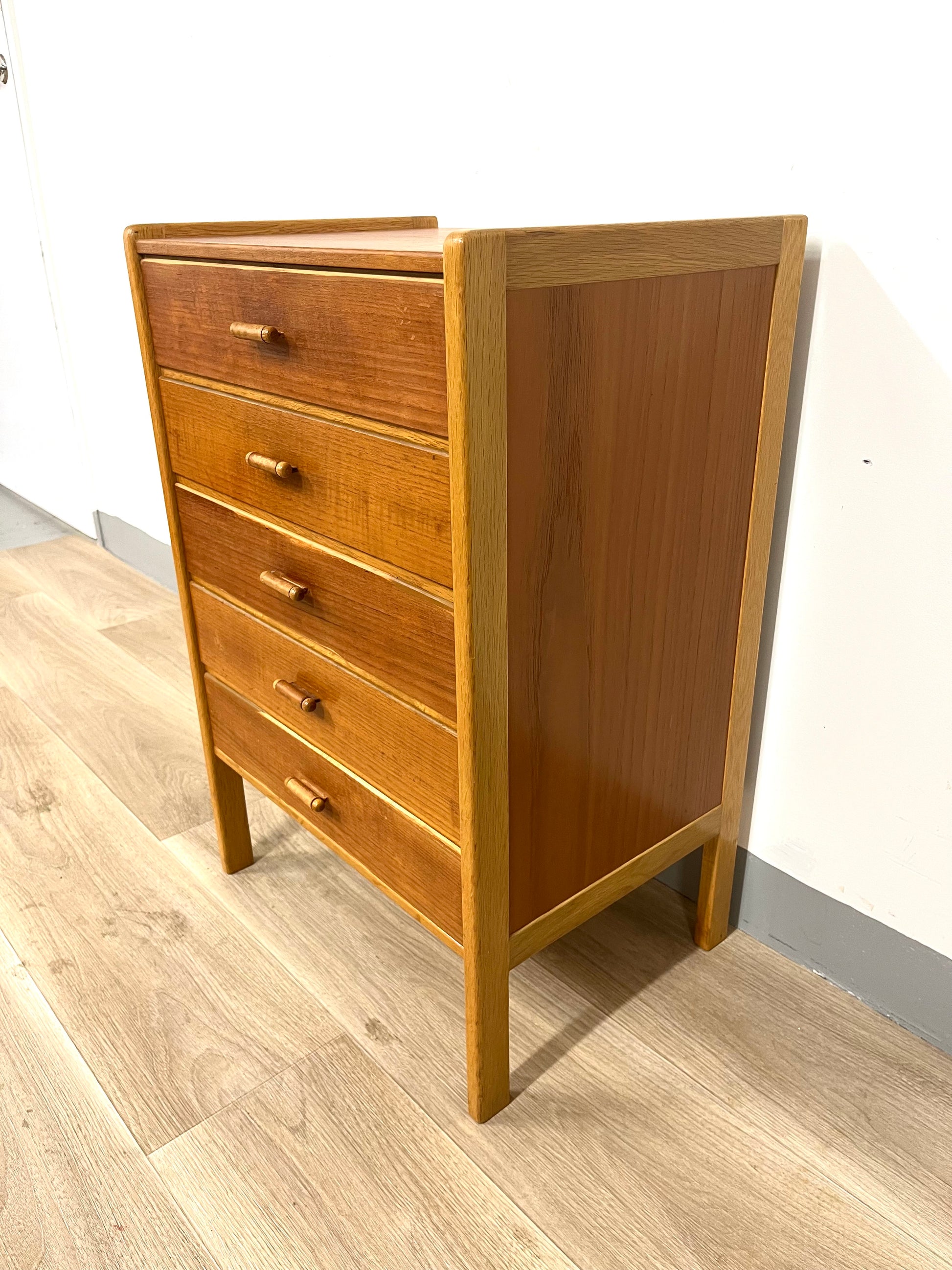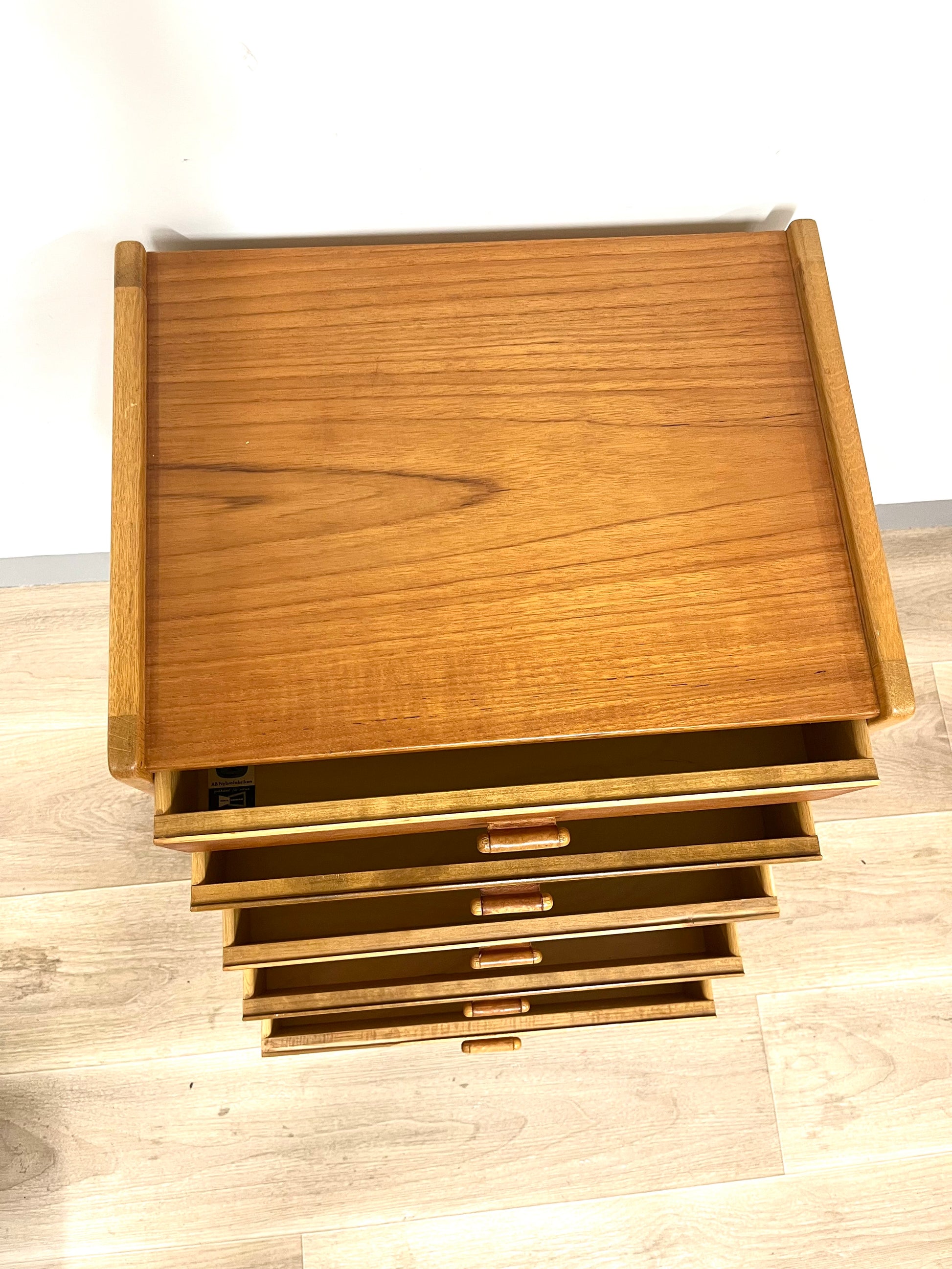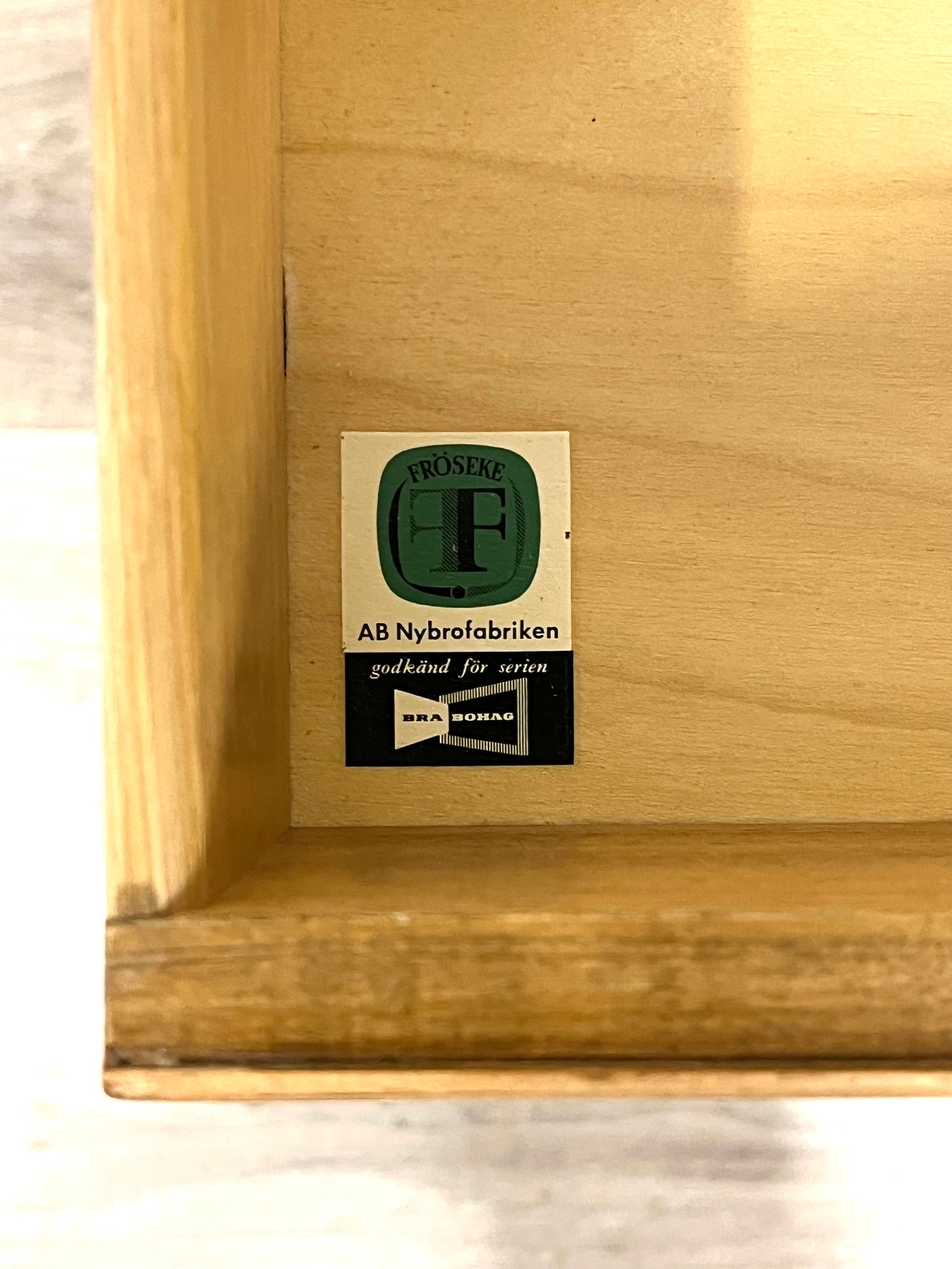 Condition: Good vintage condition. The leather handles show wear but remain functional. Some repairs and light scratches are visible on the drawer fronts.