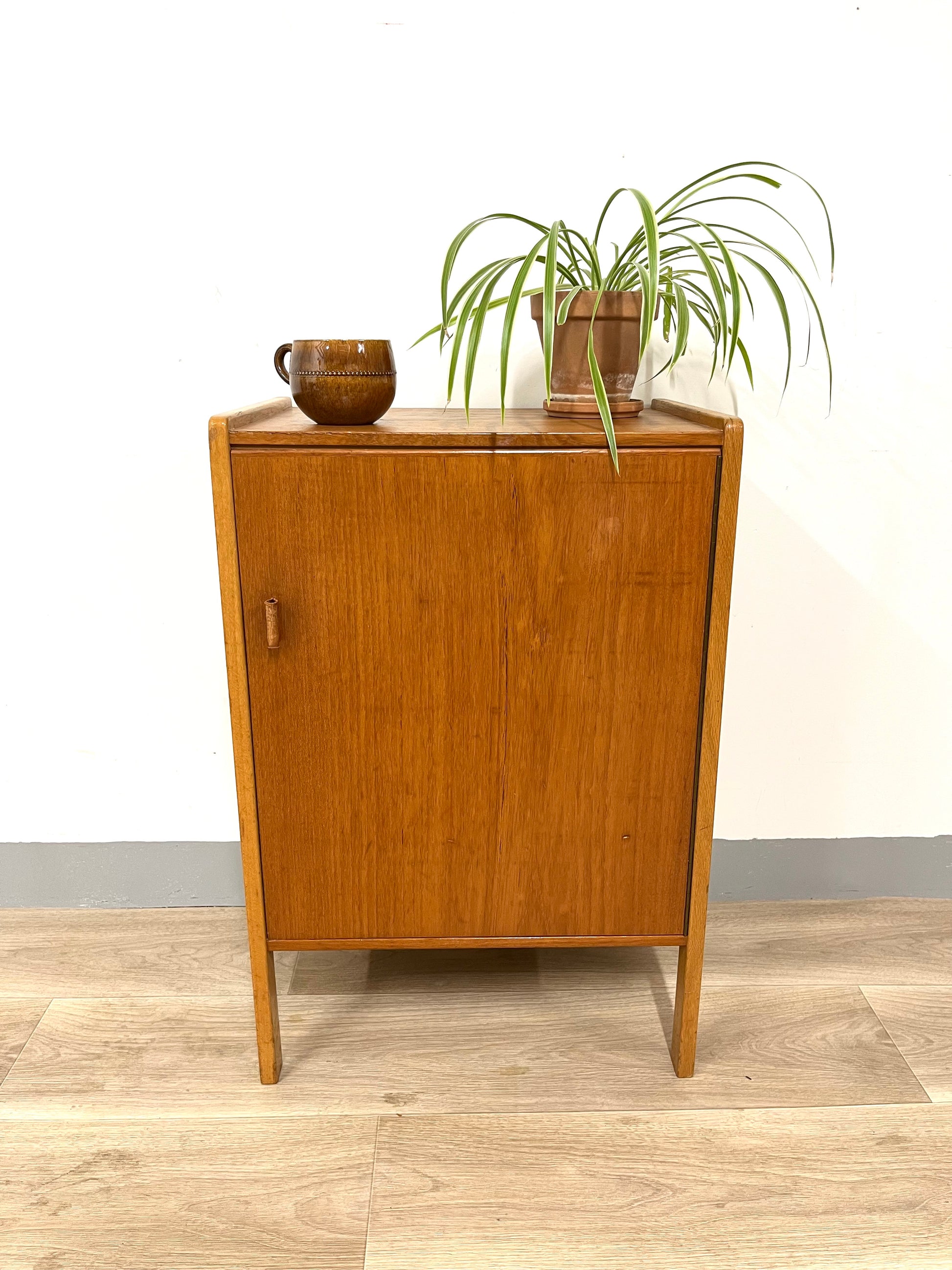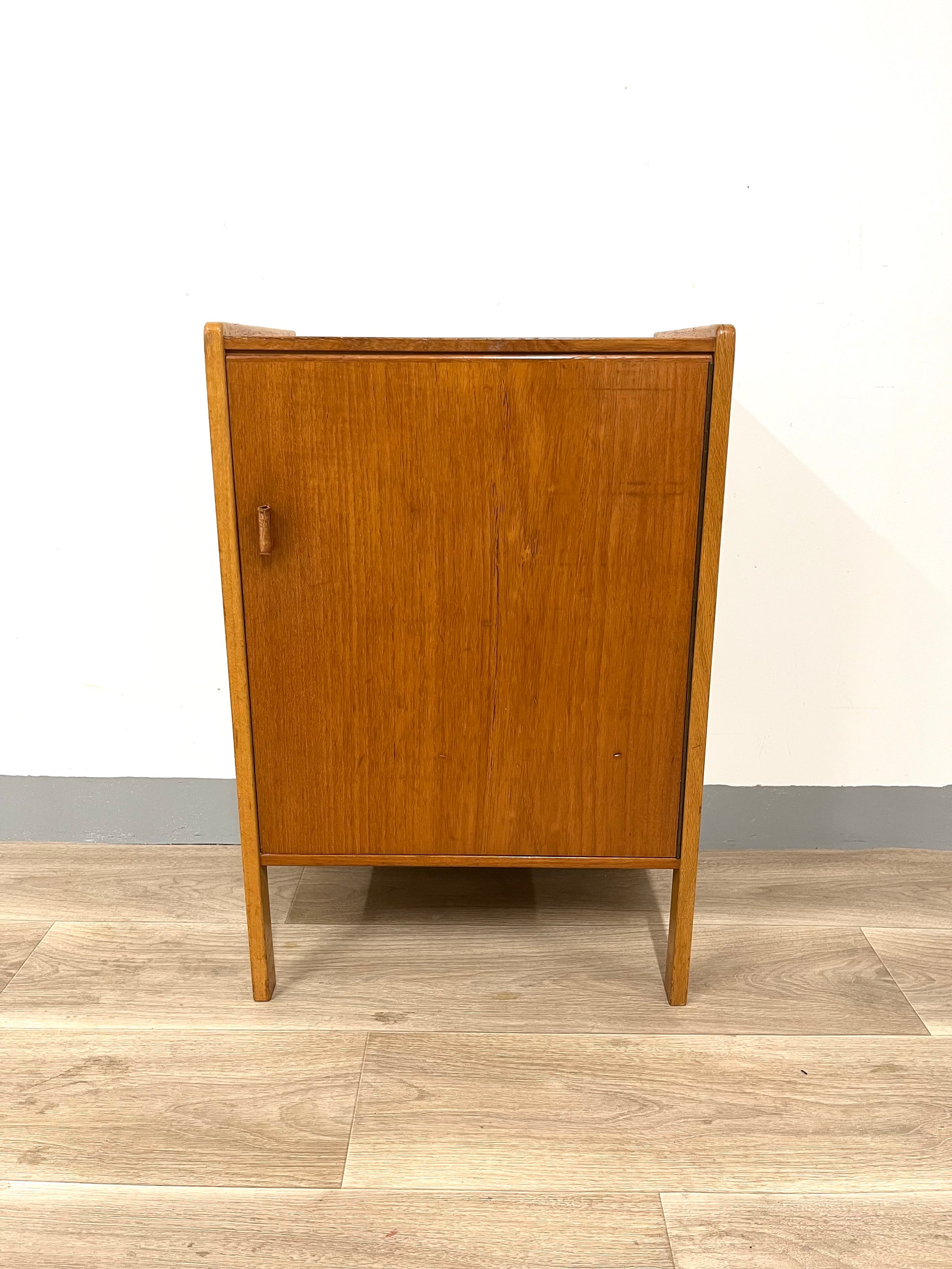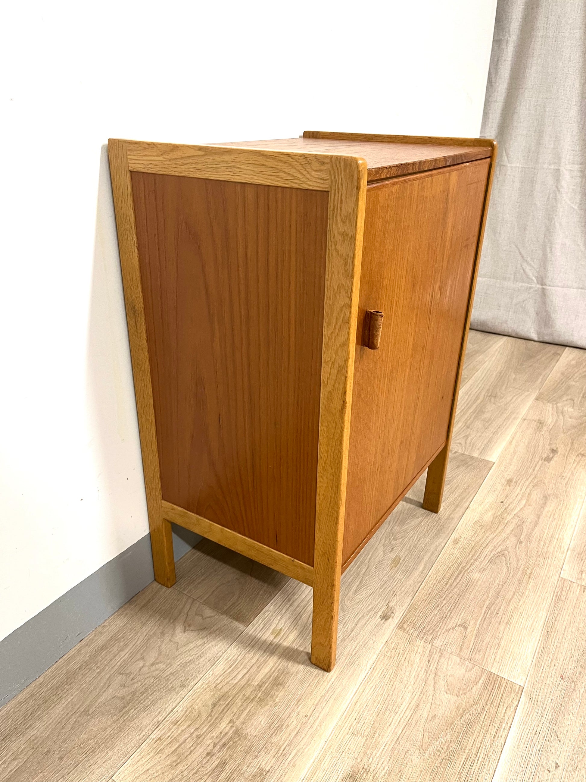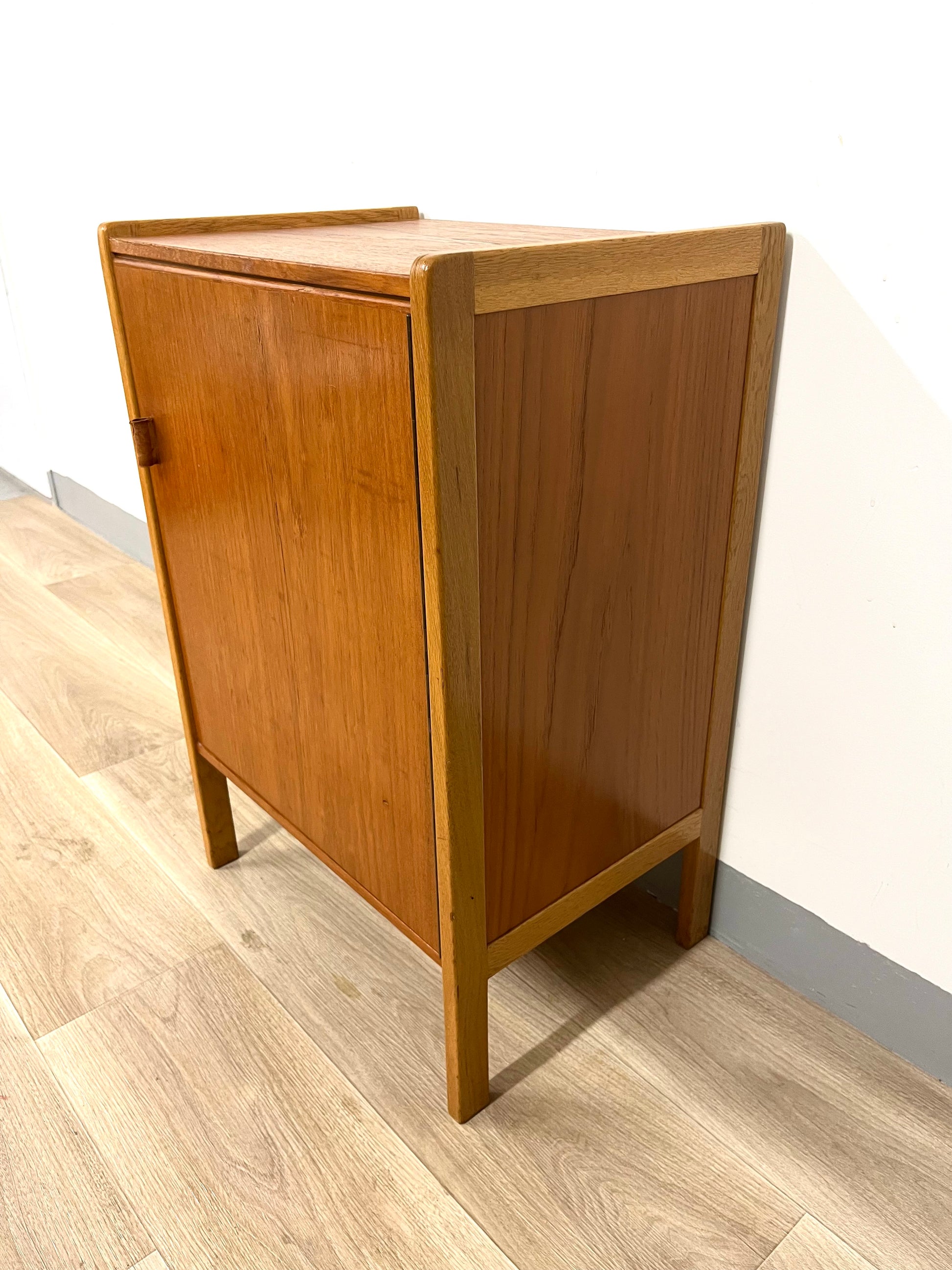 Details: Small teak cabinet with original leather handles.