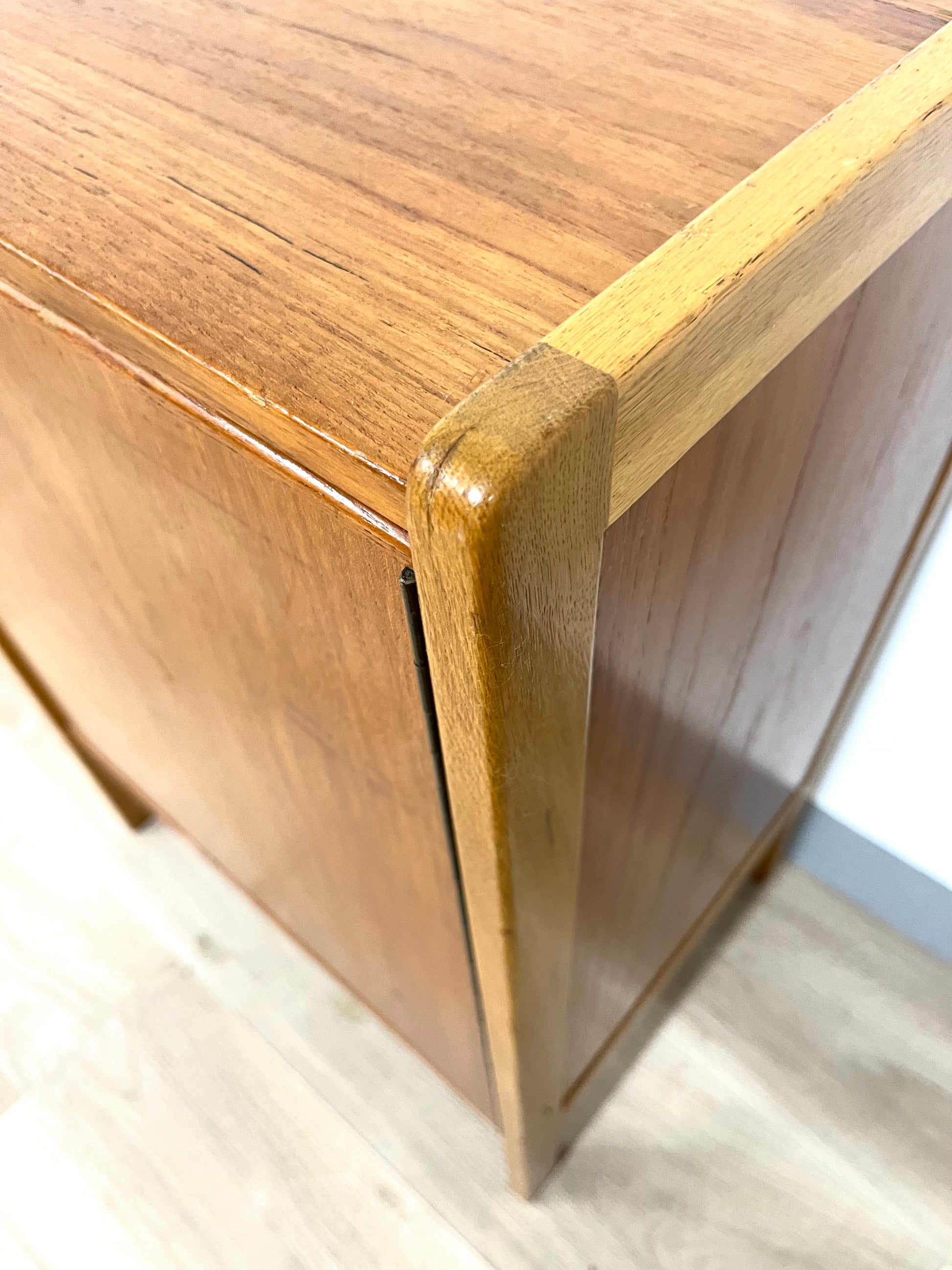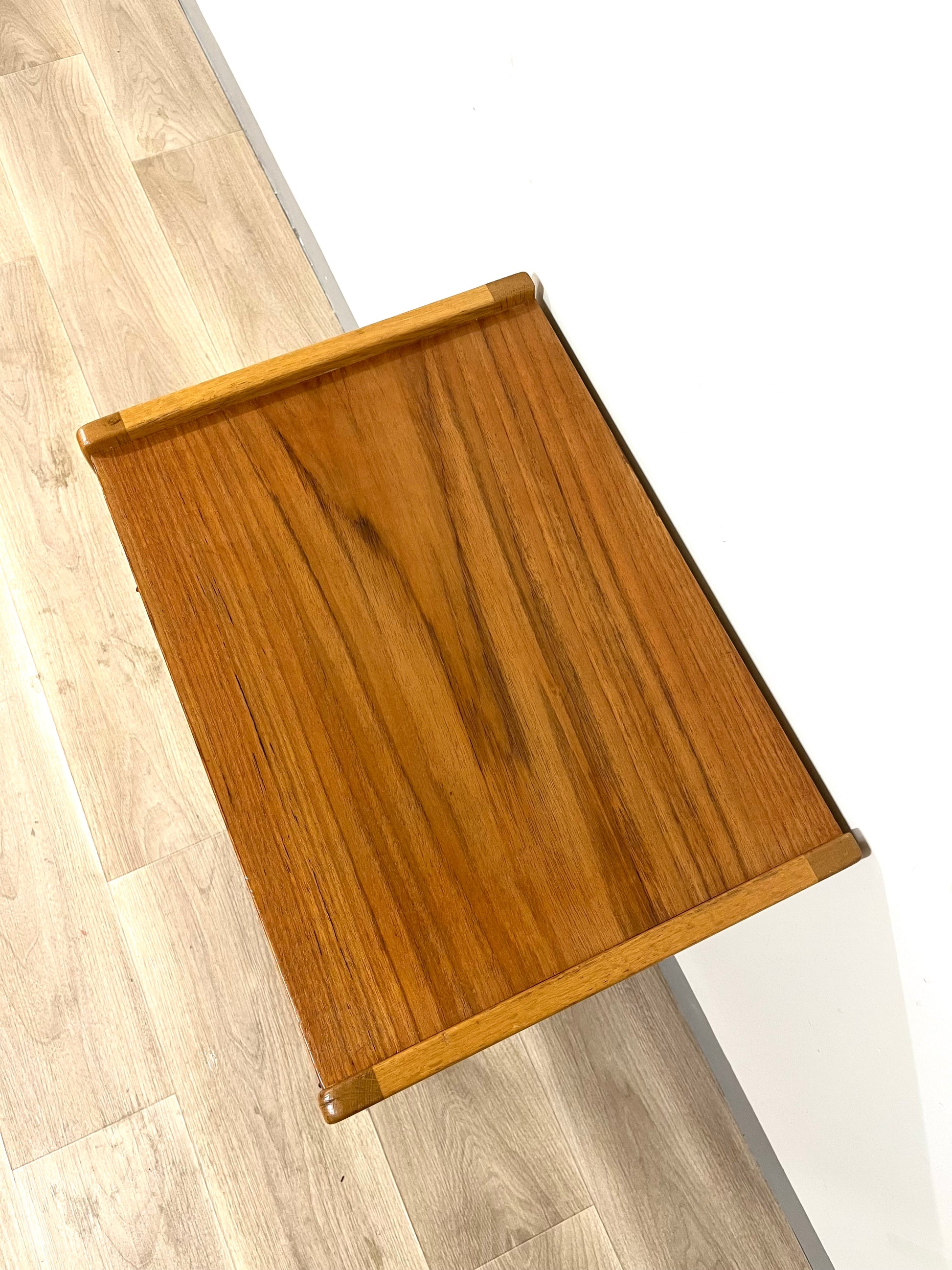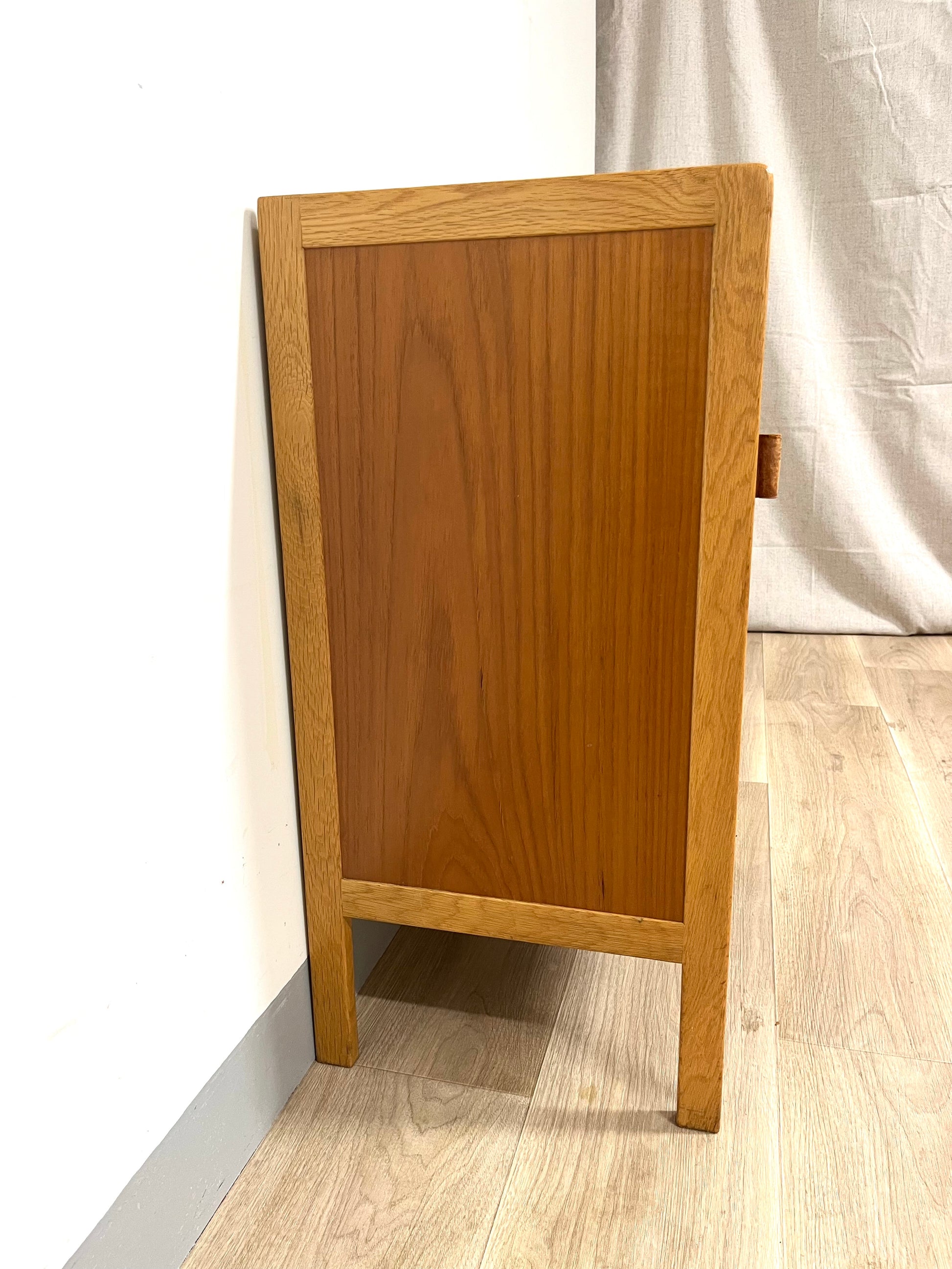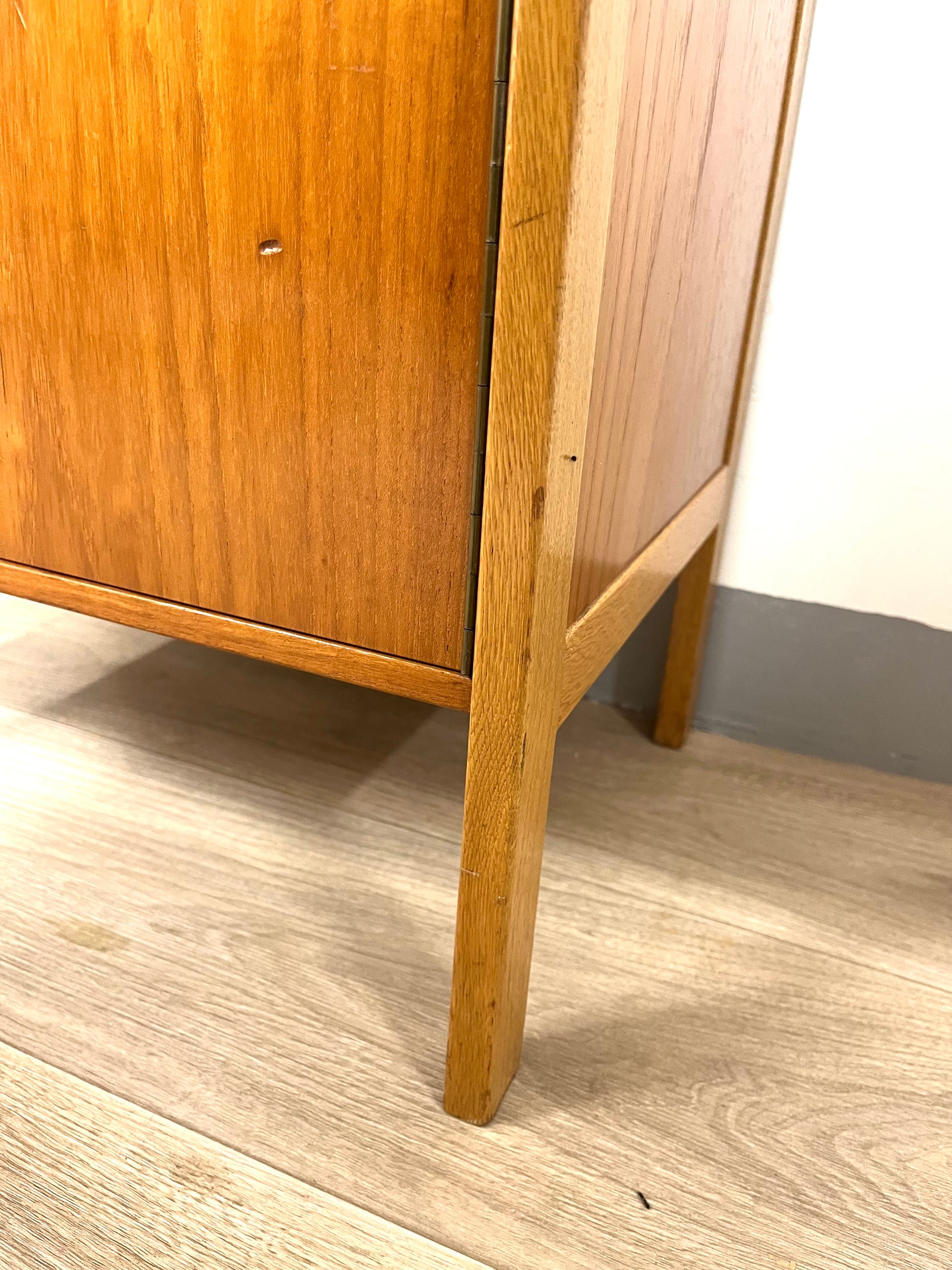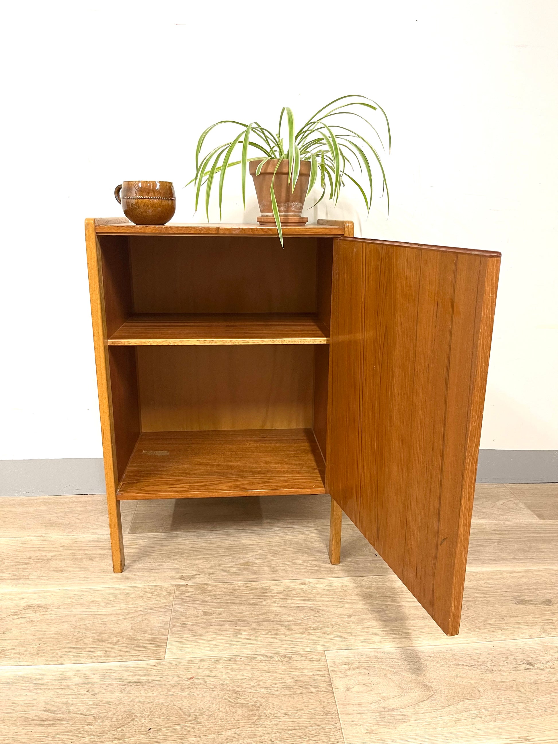 Details: Small teak cabinet with original leather handles.
