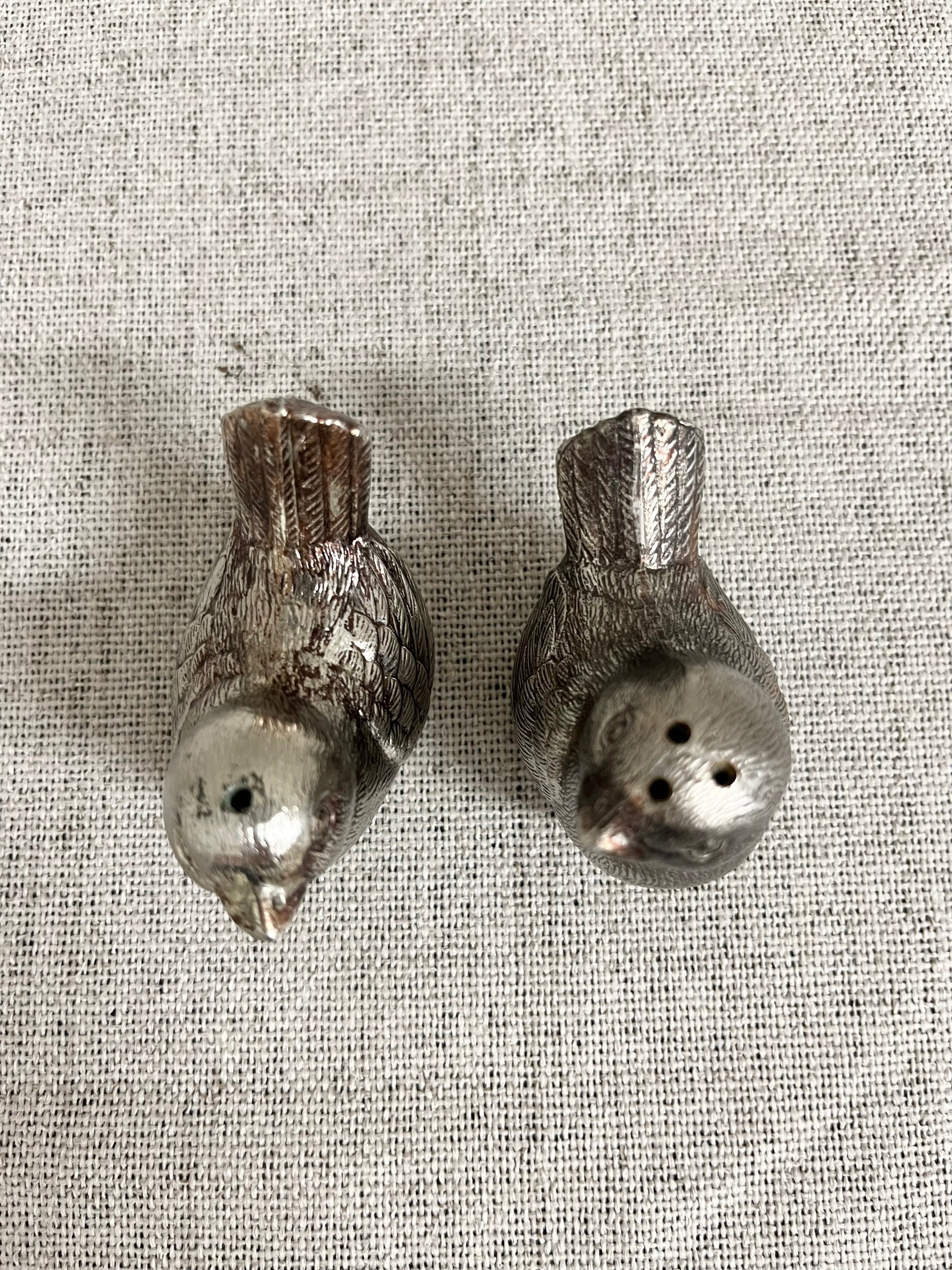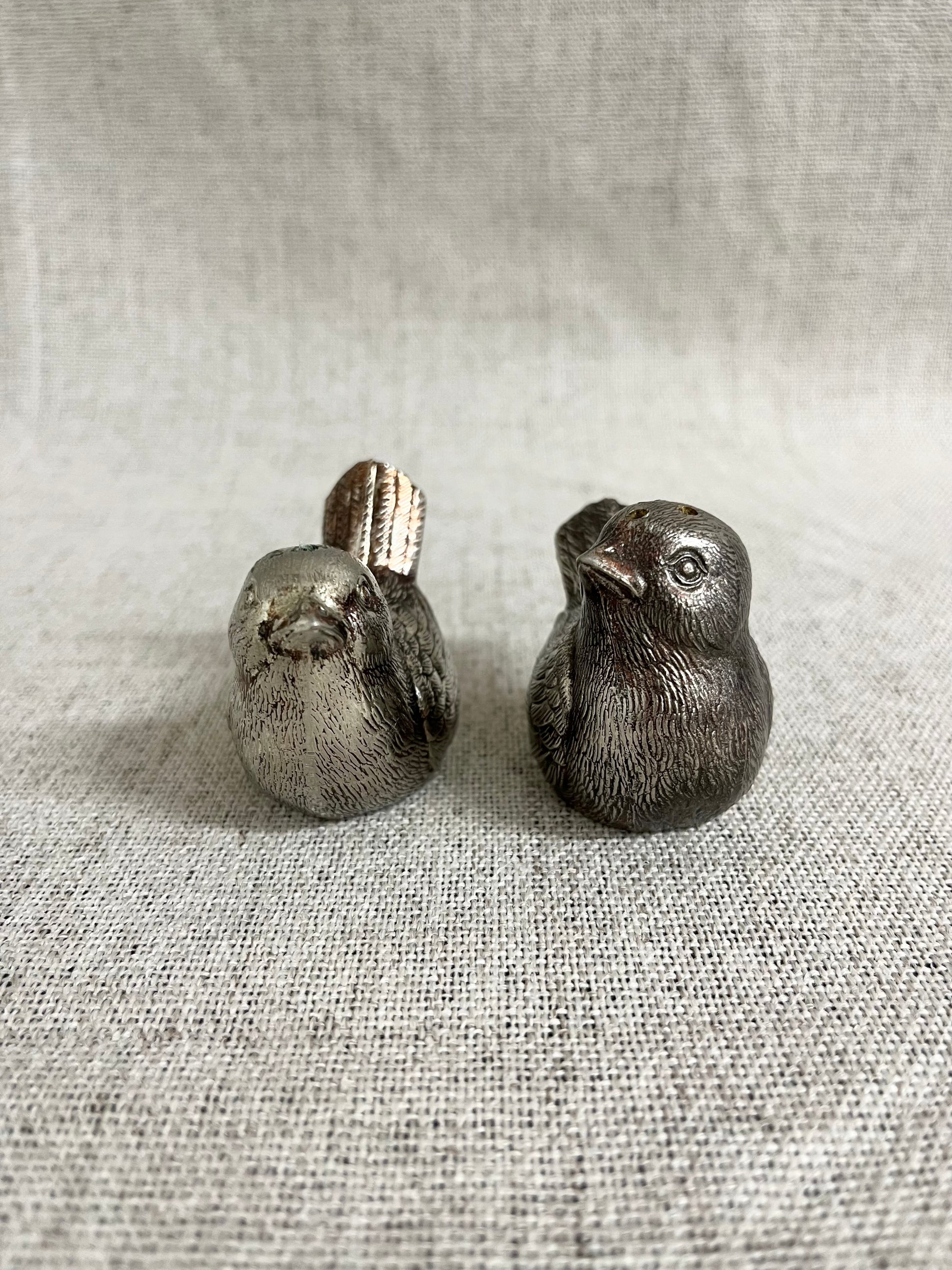 Details: A pair of salt and pepper birds with detailed feather engraving and a metallic finish. A cute detail for your dinner table or for styling shelves in your kitchen. Sold as a pair.