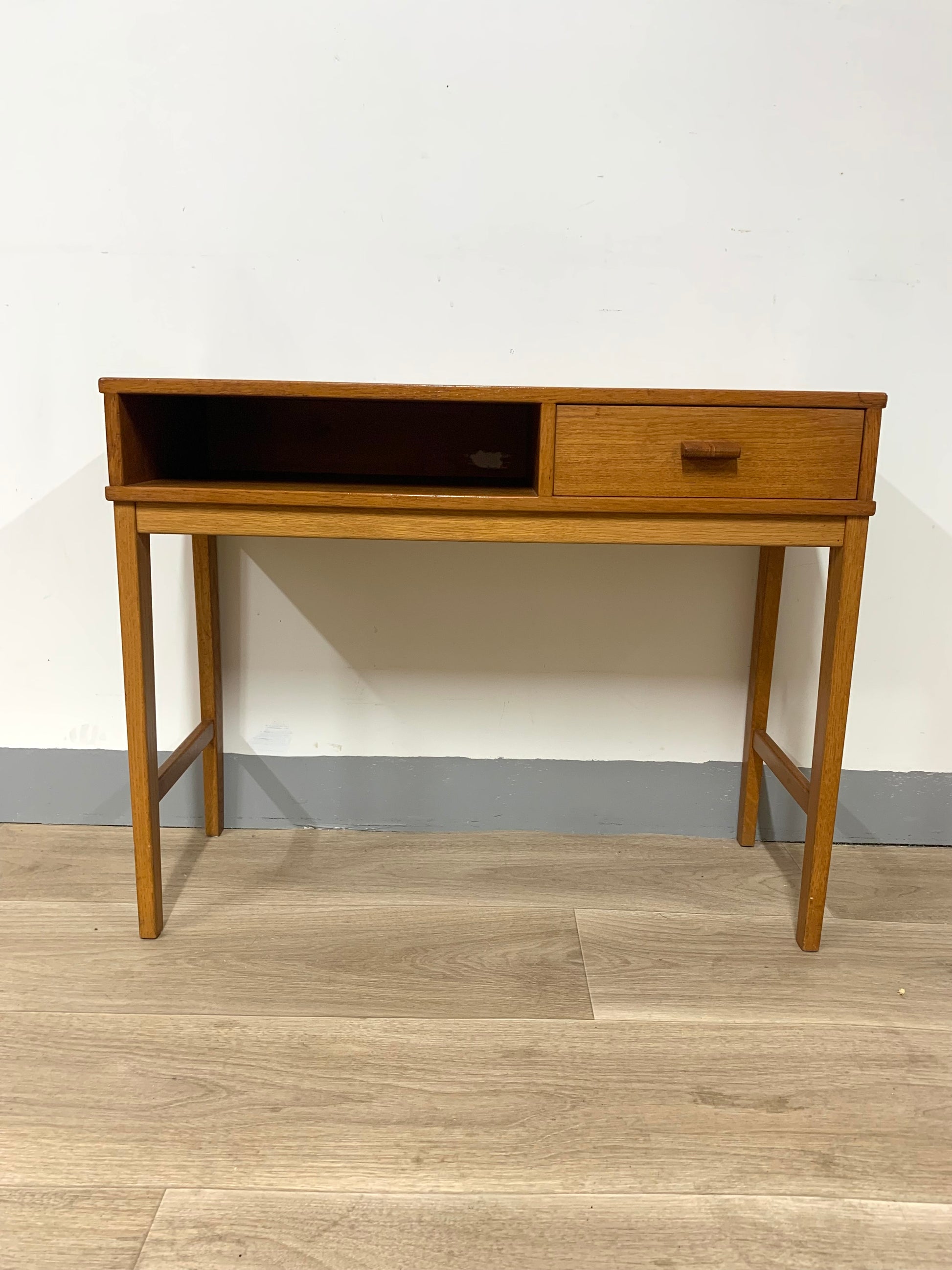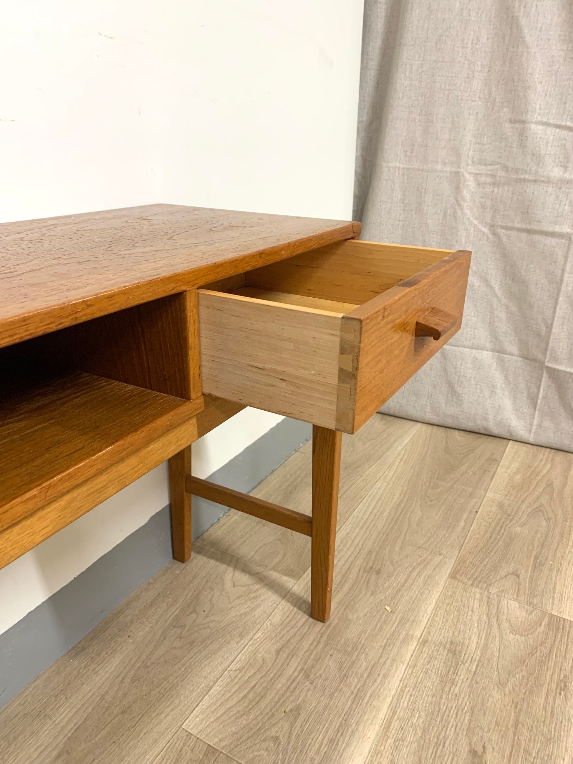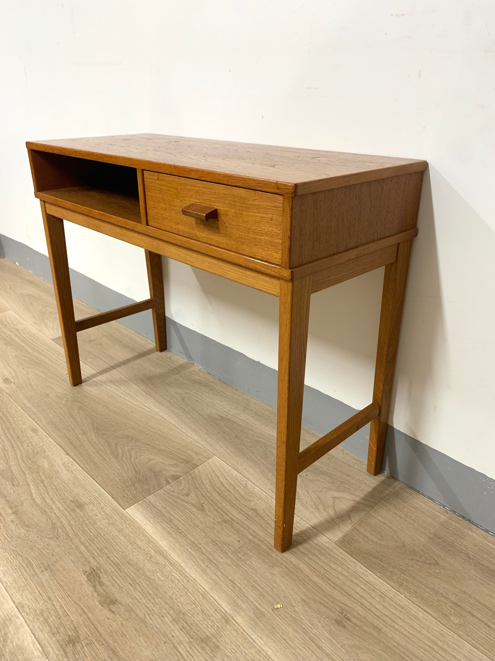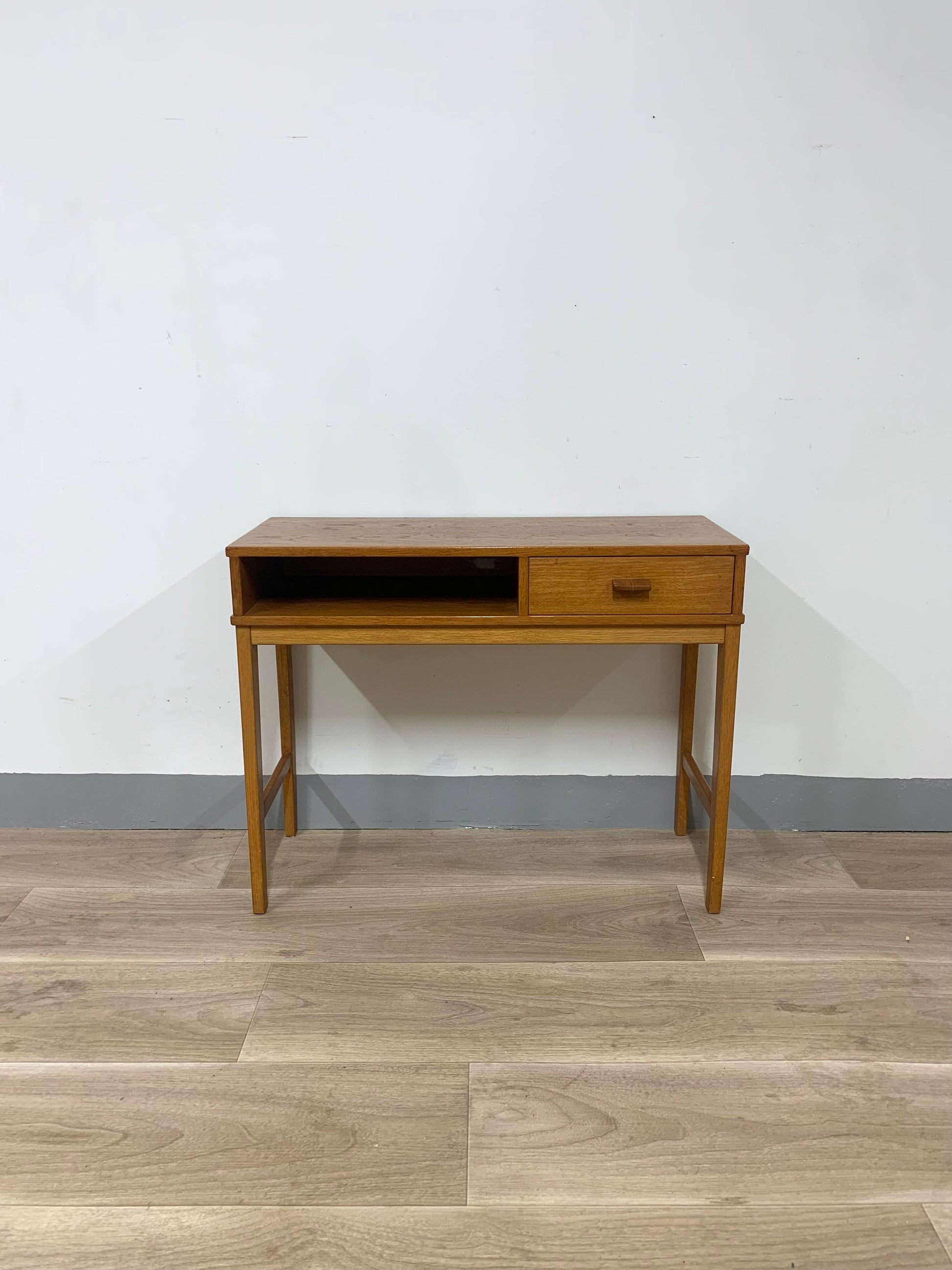 This small vintage piece features one open shelf and a single drawer with a rectangular wooden handle. The clean lines and square legs with side supports create a well-proportioned and practical silhouette.