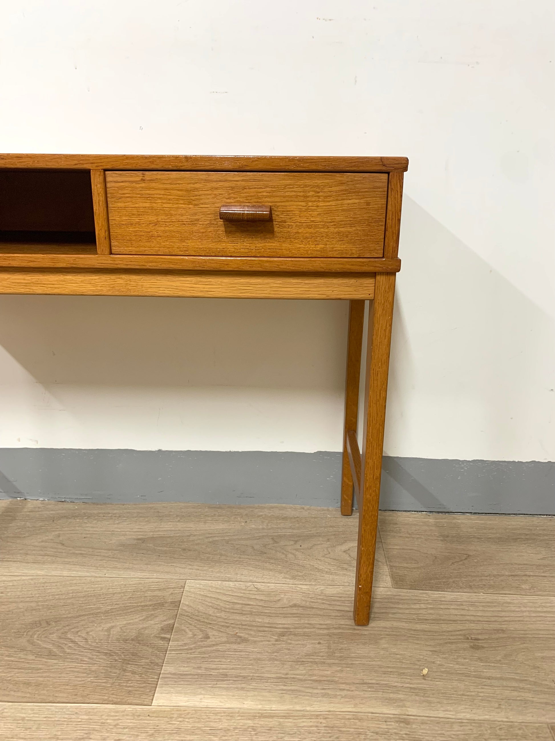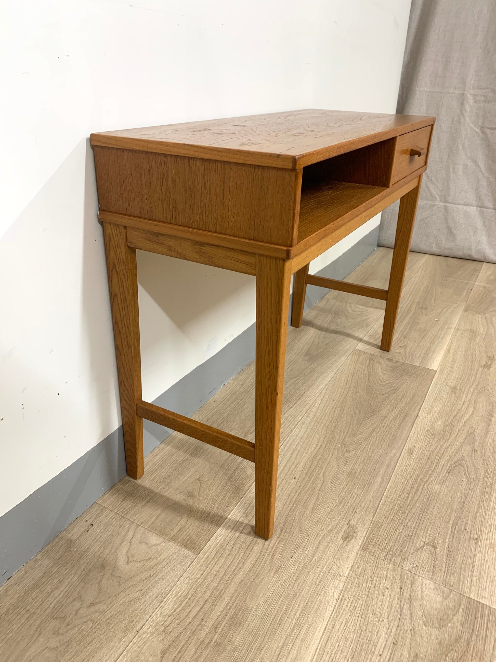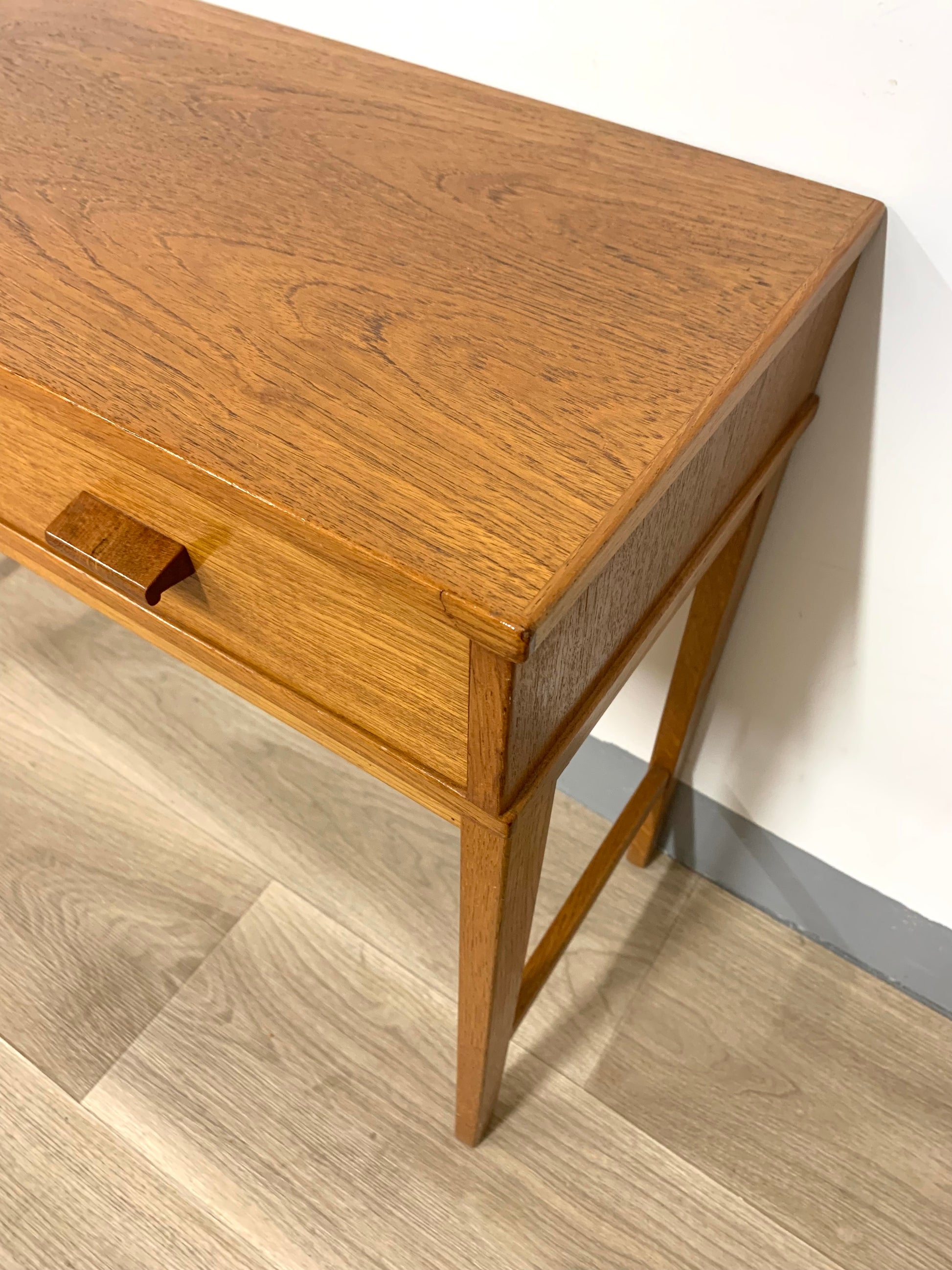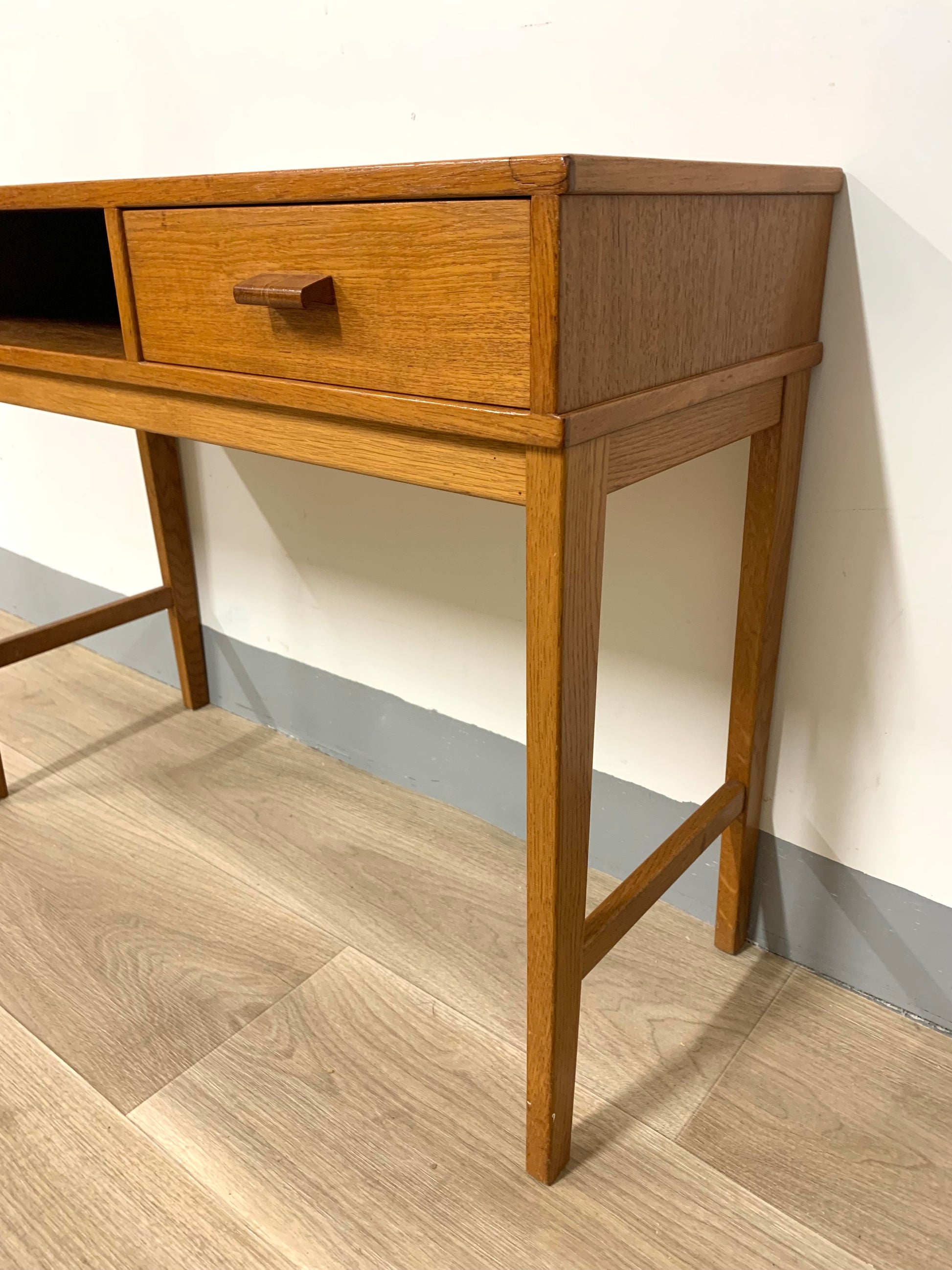 This small vintage piece features one open shelf and a single drawer with a rectangular wooden handle. The clean lines and square legs with side supports create a well-proportioned and practical silhouette.