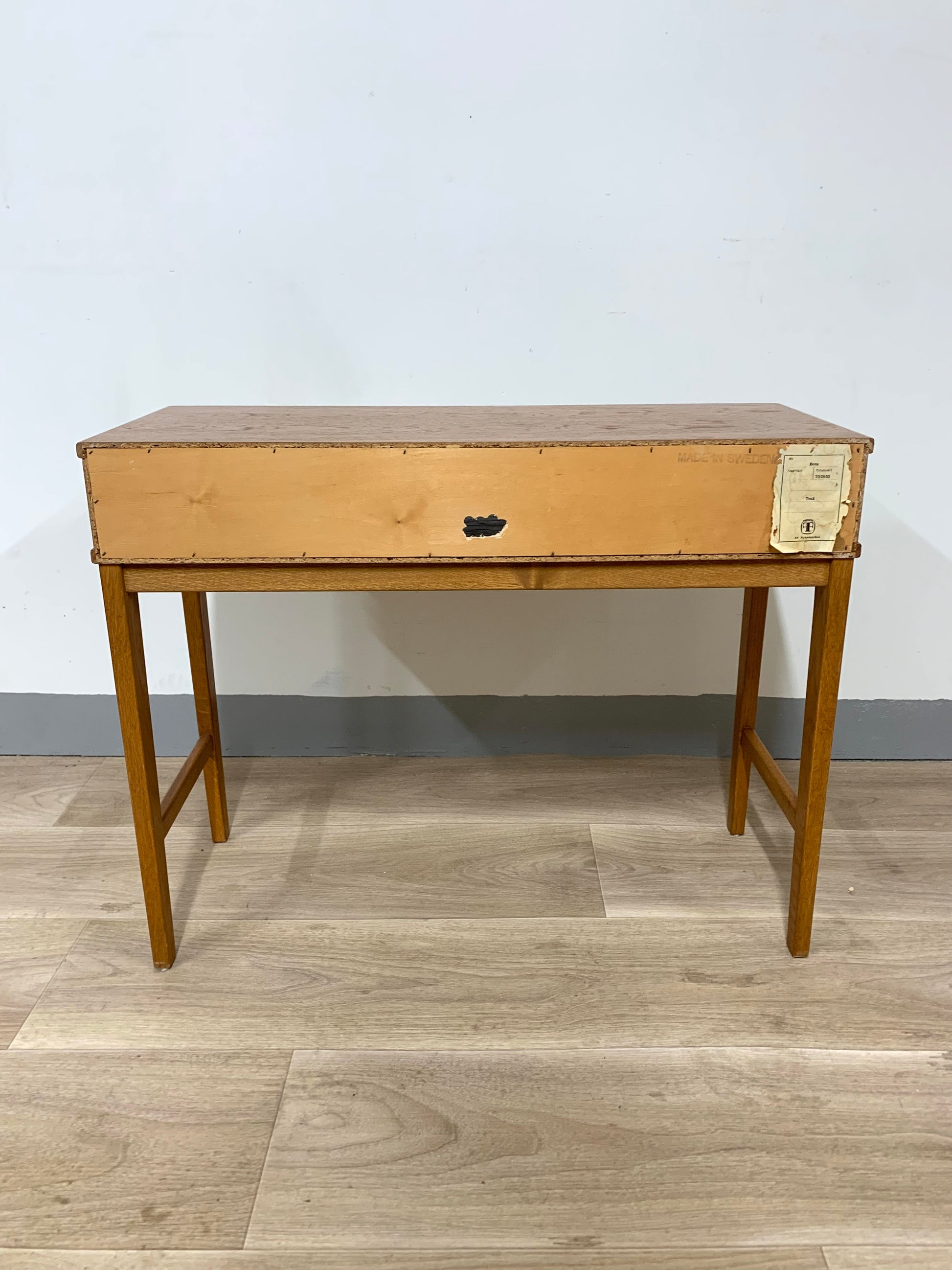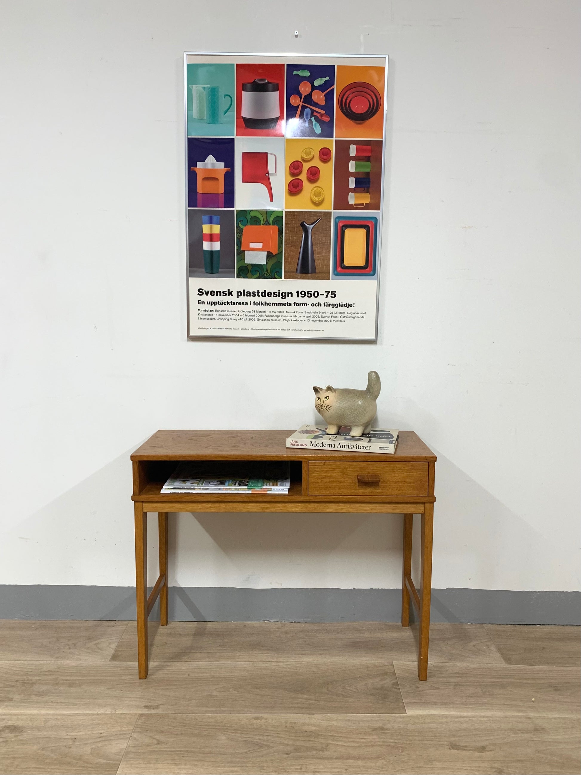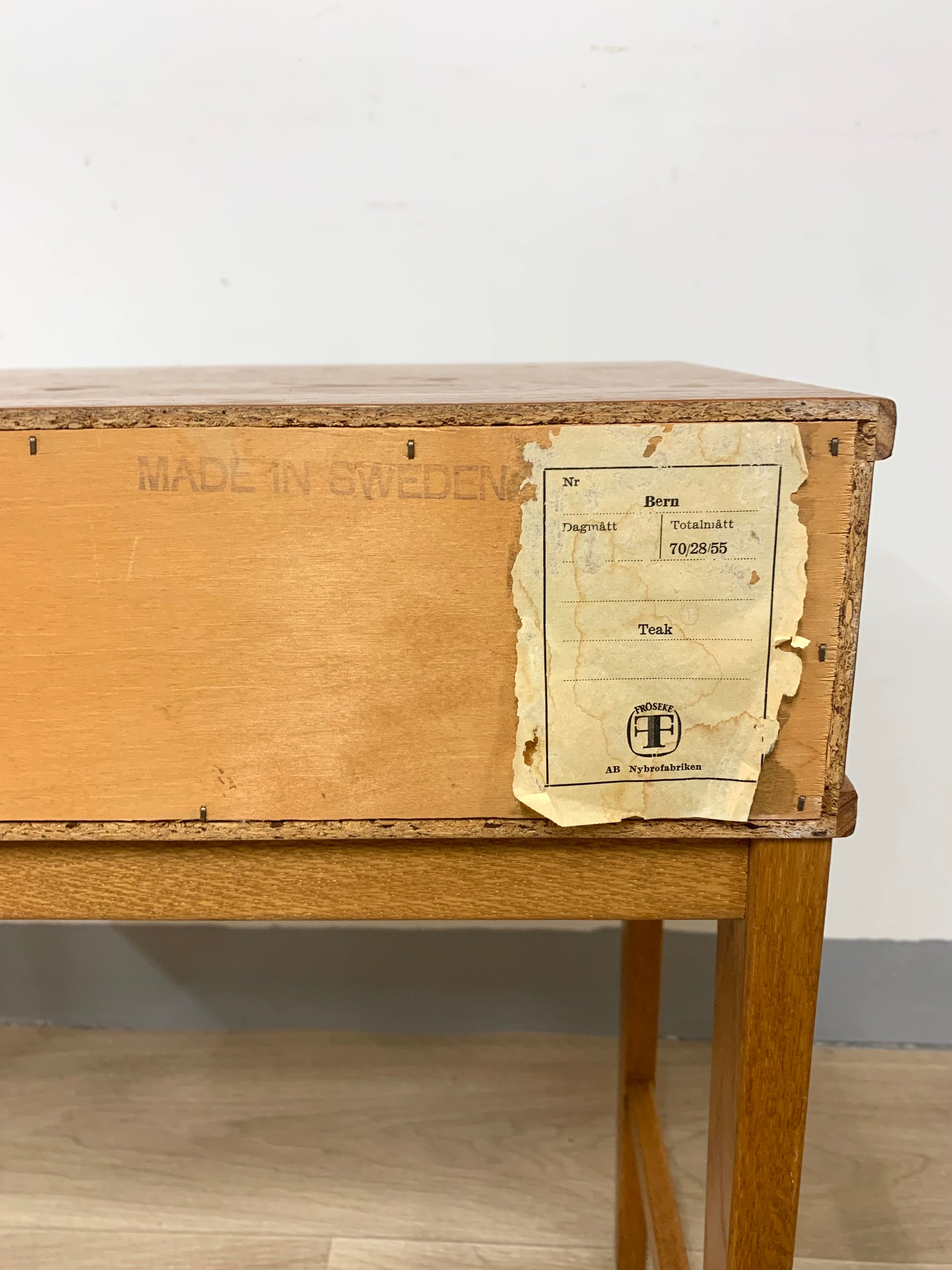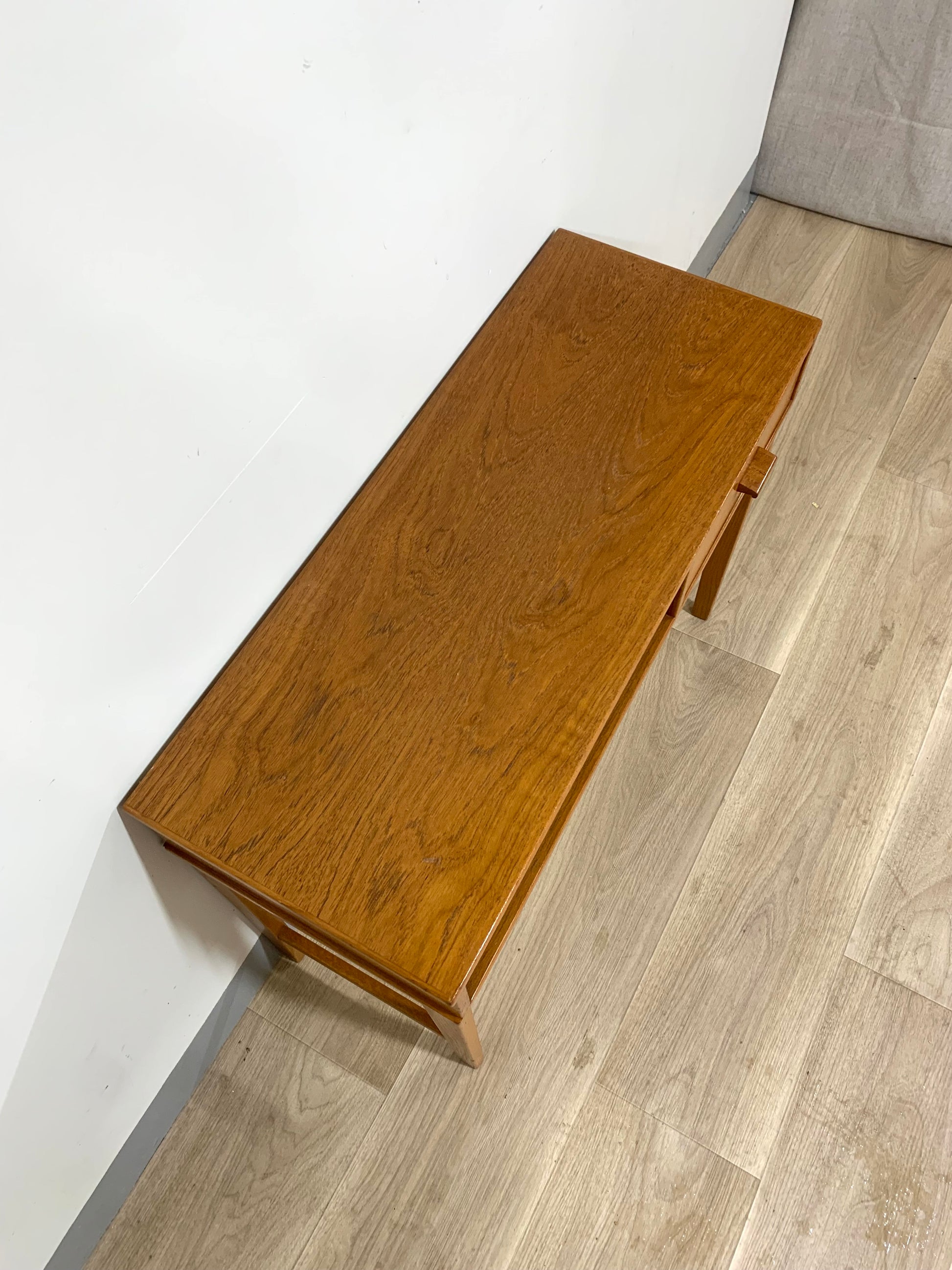 This small vintage piece features one open shelf and a single drawer with a rectangular wooden handle. The clean lines and square legs with side supports create a well-proportioned and practical silhouette.